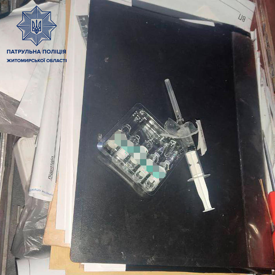 В автівці патрульні виявили скляну пляшечку, ампули, шприц з прозорою речовиною, ймовірно наркотичного походження.