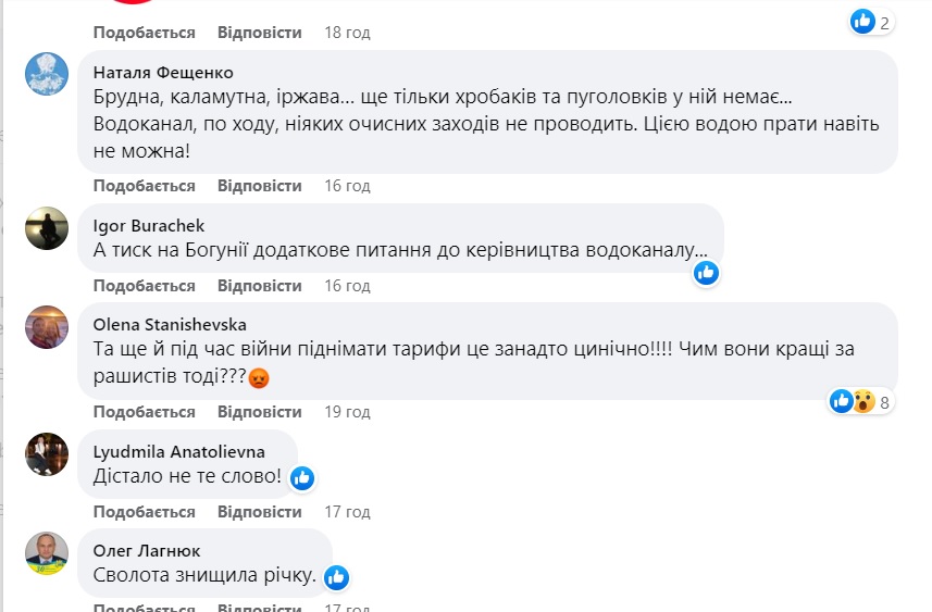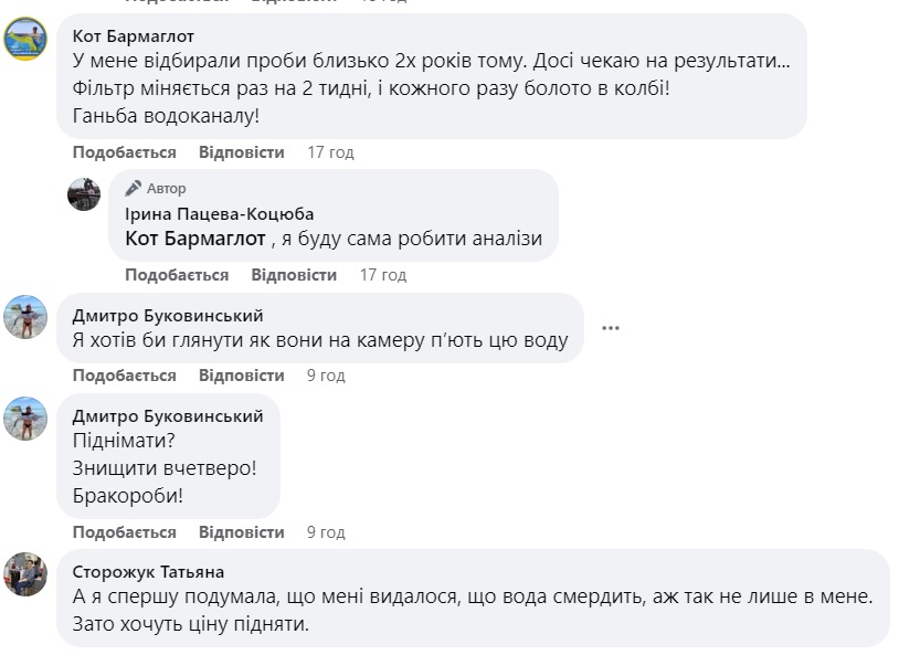 “А я спершу подумала, що мені здалося, що вода смердить, але так не лише в мене. Проте хочуть ціну на воду хочуть підняти”.