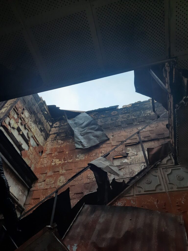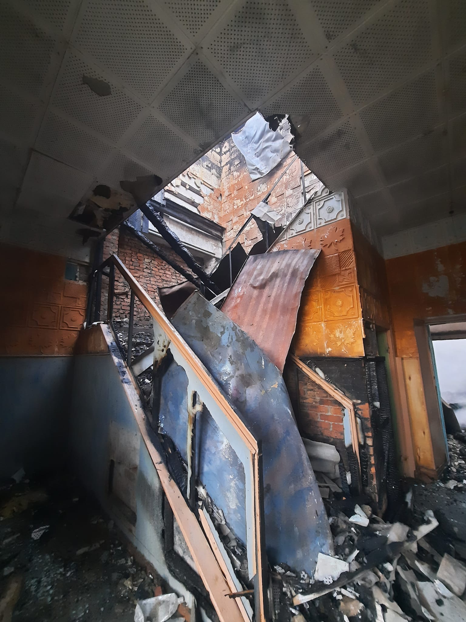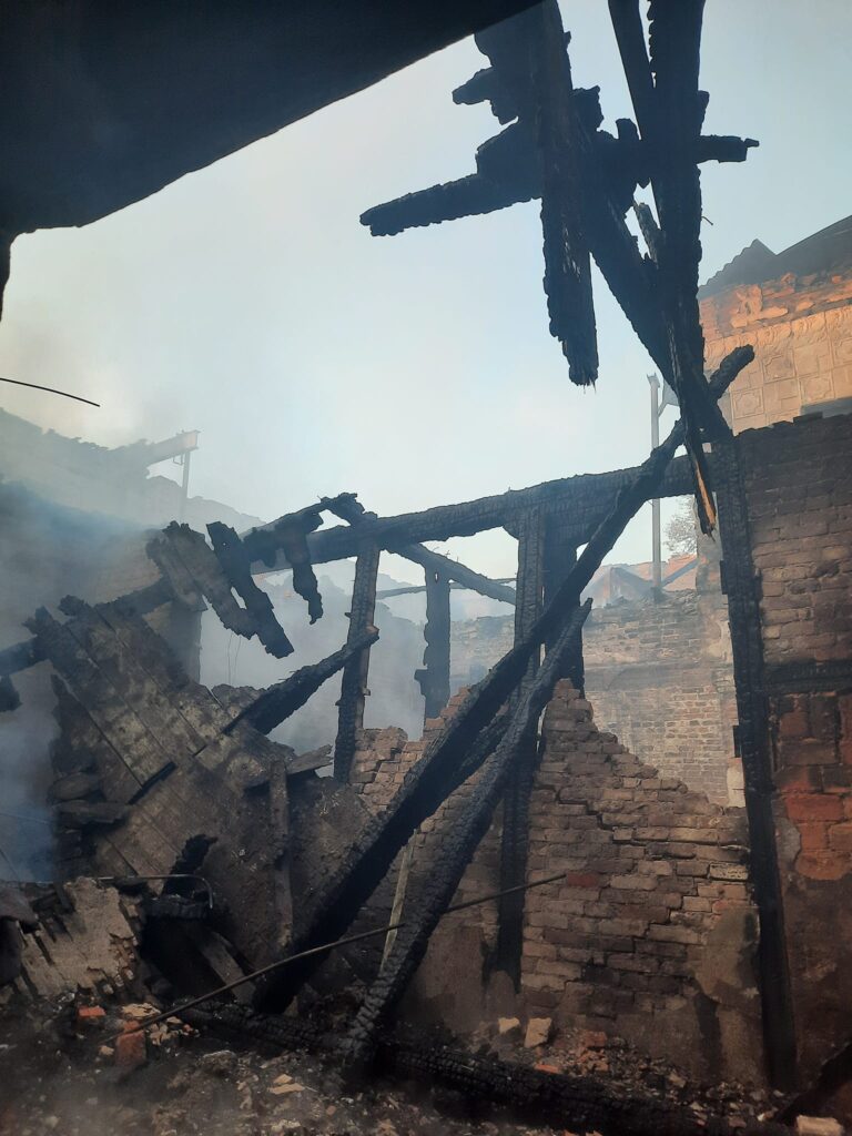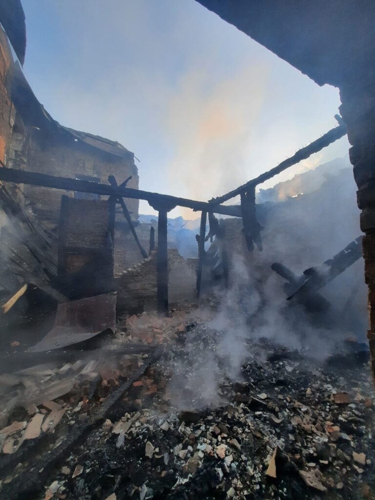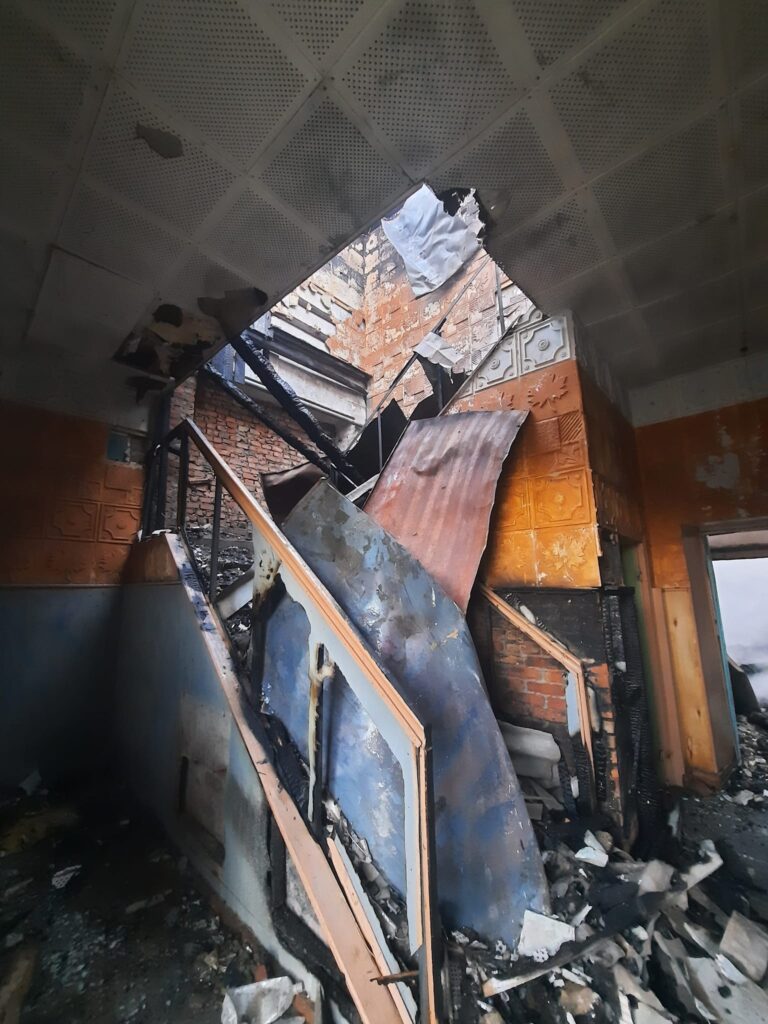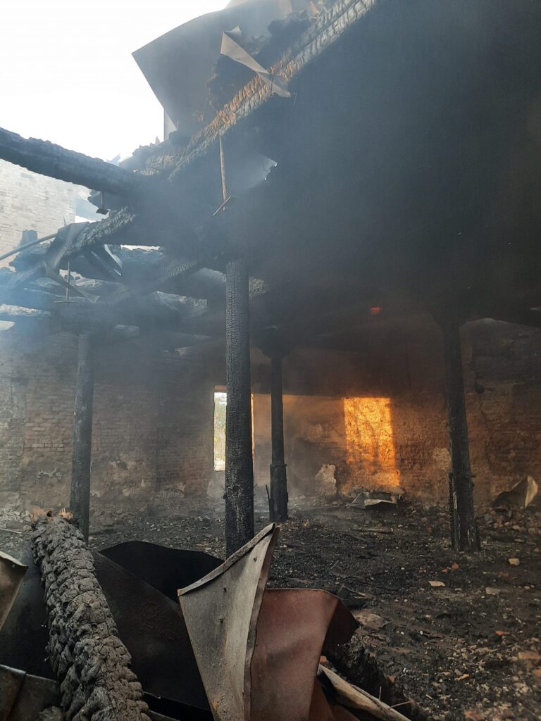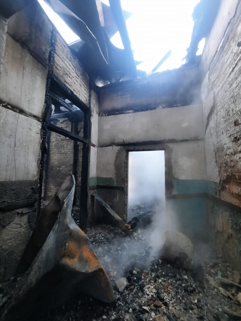 На фото результат пожежі. Вигорів весь дах, дерев’яне перекриття, балки між цегляними кладками будинку культури”.