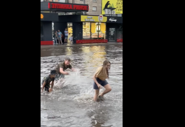 Місцеві у соцмережах діляться відео затопленої вулиці біля зупинки “Ринок”, де дітлахи гралися у воді.