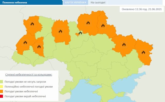 Найвищий рівень пожежної небезпеки оголосили в Україні. Найнебезпечніші погодні умови 21 червня у Житомирській, Волинській, Львівській, Тернопільській, Чернігівській, Сумській, Харківській, Луганській областях та в Києві.