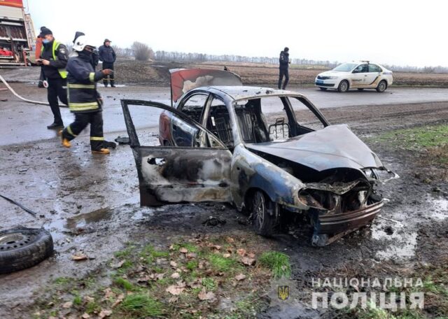 "Попередньо встановлено, що водій автомобіля «Део Ланос», 27-річний житель Вінниччини, рухаючись по вул. Заводській вказаного населеного пункту, на заокругленій ділянці дороги не впорався з кермуванням, виїхав на зустрічну смугу руху, де скоїв зіткнення з причепом вантажівки КамАЗ під керуванням 59-річного жителя Черняхівського району Житомирщини. Від удару сталося загоряння легковика, яке остаточно ліквідували працівники підрозділу УДСНС".