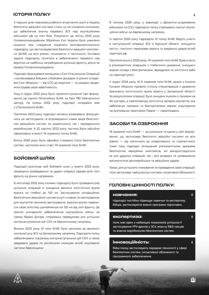 14-й окремий полк безпілотних авіаційних комплексів — один із найефективніших та найтехнологічніших підрозділів ЗСУ. Це єдиний у світі підрозділ, що працює майже з усіма існуючими безпілотними літальними системами. Ми завдаємо ворогу уражень і на тактичному рівні, і в глибині його території.