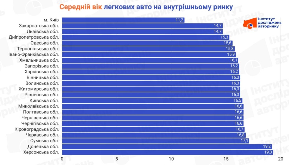 Наймолодші автомобілі зосереджені у місті Київ (11,2 року), а також у Закарпатській та Львівській областях (по 14,7 року).