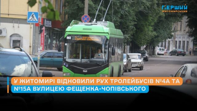Від 9 серпня у Житомирі відновлено рух тролейбусів №4А та №15А вулицею Фещенка-Чопівського. Про це повідомляє Житомирська міська рада.