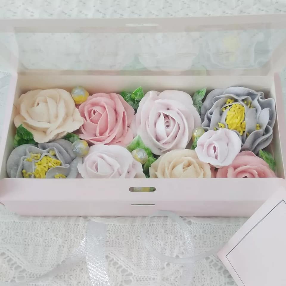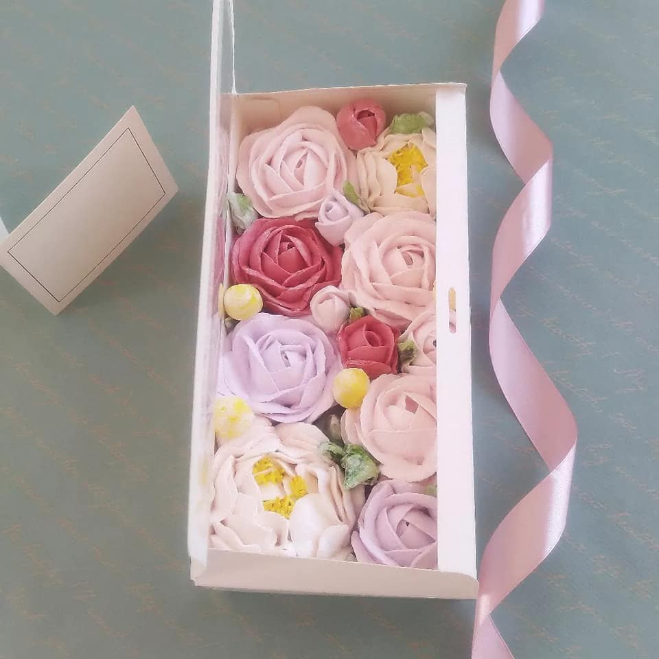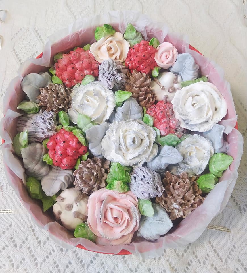 «Зефірні квіти йдуть з класичним яблучно-ванільним смаком, а от завитки – з дуже великим різноманіттям смаків: від класичного до, наприклад, томат/лайм, поєднання з травами, квітами, кавою, алкоголем, – веде далі Олена. – Замовляють зефірні композиції на дні народження, ювілеї, весілля, професійні чи дитячі свята. Переважно звертаються житомирянин, з інших міст – рідко, та й відправляю поштою лише те, що у коробках. Десь половина клієнтів віддають ініціативу в мої руки і дозволяють творити на власний розсуд. Це мої улюблені замовлення, де можу собі дозволити пофантазувати. Інші ж обирають та узгоджують види квітів, кольорову гаму виконання усього букету. Розмір основи, на яку кріпляться квіти – від 16 см і до 45 см в діаметрі, але самі букети виходять ще більші. Коробочки можуть бути з однієї квіткою, може бути коробочка в діаметрі 21 см тільки з зефірними квітами, а є коробочки, де нижній шар – фруктовий зефір, а зверху – зефірні квіти».
