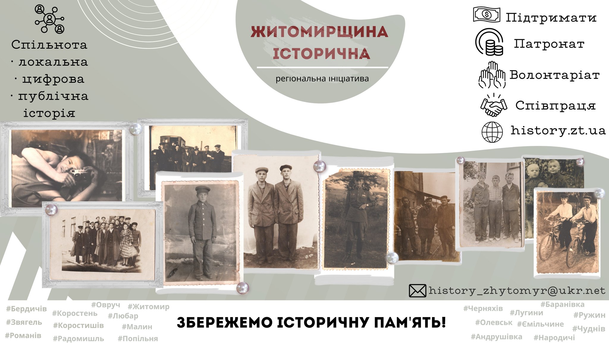 «Архів регіональної ініціативи «Житомирщина історична» фактично почав формуватися ще у 2010 році, а починаючи з 2018 року, проводиться плановий збір фотографій. Наша ініціатива професійно займається пошуком, оцифруванням та представленням у вільному доступі в мережі фотографій другої половини ХІХ – ХХІ століть, які є документальними свідченнями історії Житомирщини в контексті минулого України та Центрально-Східної Європи, – відзначають представники регіональної ініціативи. – Фотографічний фонд цифрового архіву формується пошуковими стараннями нашої команди, придбаннями раритетних фотографій на аукціонах та завдяки приватним особам, які передають нам свої сімейні альбоми. Цифровий архів наочно дозволяє студіювати повсякдення жителів Житомирщини на різних етапах, ознайомитися з локальними аспектами соціального, культурного, економічного виміру життя, особливостями збереження ідентичності та традицій. Наш цифровий архів піклується про збереження унікальної візуальної спадщини Житомирщини. Саме тому фотографії впорядковано відповідно до хронологічного та тематичного принципу, а кожна одиниця зберігання інвентаризована, впорядкована та містить опис, який уклали учасники нашої ініціативи. Світлини з нашого цифрового архіву дають широкі можливості як для жителів регіону, його вихідців, так і для науковців дисциплін суспільствознавчого циклу, можуть бути використані для освітніх, соціальних та культурних заходів із зазначенням відповідних покликань. Із задоволенням приймемо на оцифрування сімейні колекції фотографій. Наша регіональна ініціатива заохочує волонтаріат та стажування. Разом з нами волонтери і стажери отримають цінний досвід з оцифрування та розвитку фотоісторії Житомирщини».