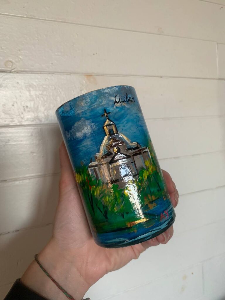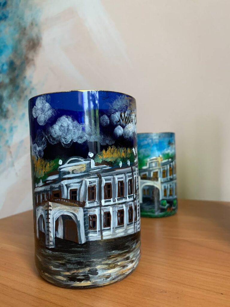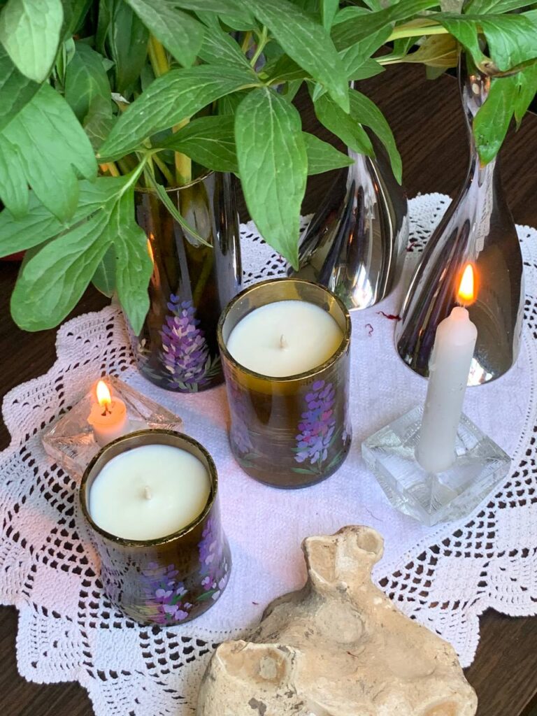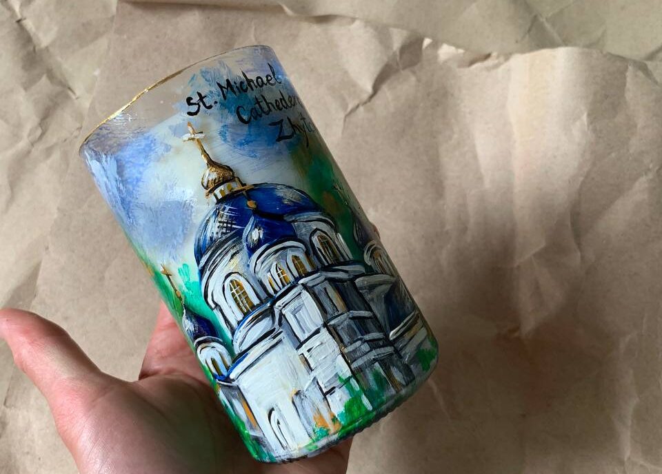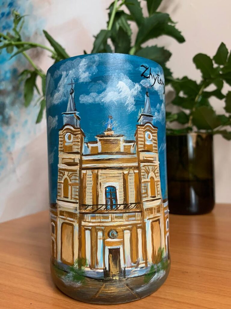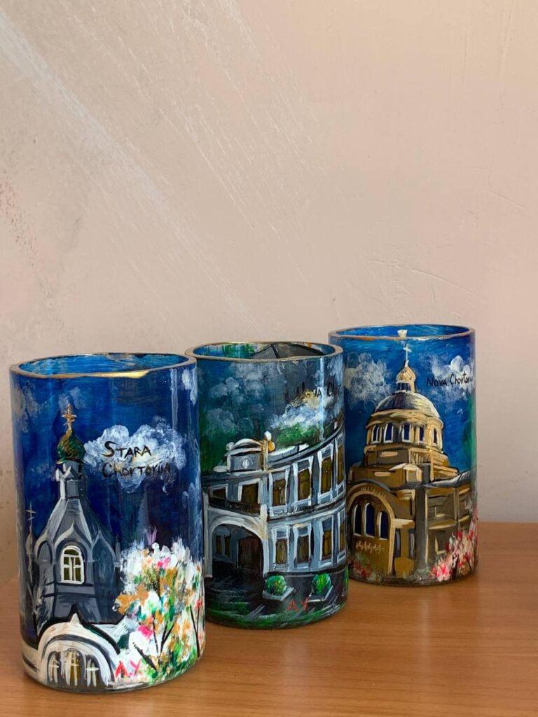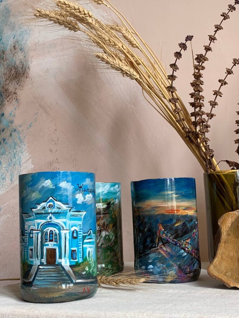 Проте, деякі пляшки, завдяки оригінальній формі чи кольору, почали отримувати шанс на друге життя і багаторазове використання. Восени минулого року придбала склоріз і спробувала порізати перші пляшки, на яких потім з’явилися різні малюнки, переважно квіткова й геометрична тематика, а також споруда церкви у рідному селі Стара Чортория. До речі, саме цей виріб був досить популярним – замовляли односельці і ті, хто перебував за кордоном. Виготовила більше 10 екземплярів. Також зверталися із проханням намалювати церкви із сусідніх населених пунктів. У таку тару дівчина заливала соєвий віск з різним ароматом на вибір. Після того як свічка догорить, можна залити наступну або просто використовувати ємкість як підставку для косметики чи канцелярії тощо.