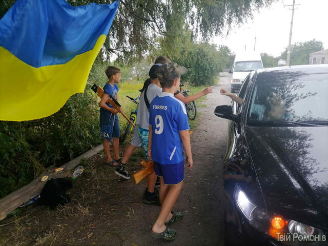 Незвичний блокпост створили шестеро дітлахів у смт Романові в районі склозаводу. Діти встановили знак “STOP. Контроль”, взяли до рук дерев’яну зброю, поставили контейнер для збору коштів із підписом “На ЗСУ”.