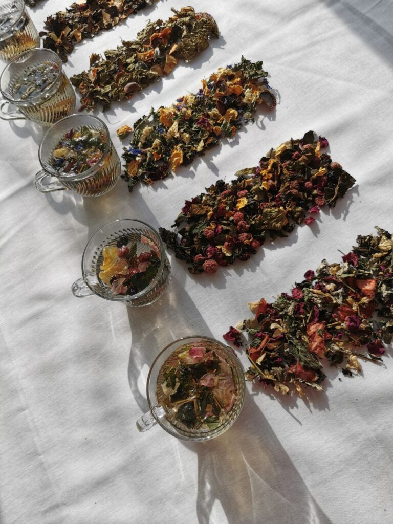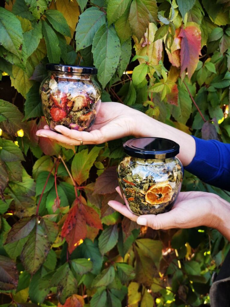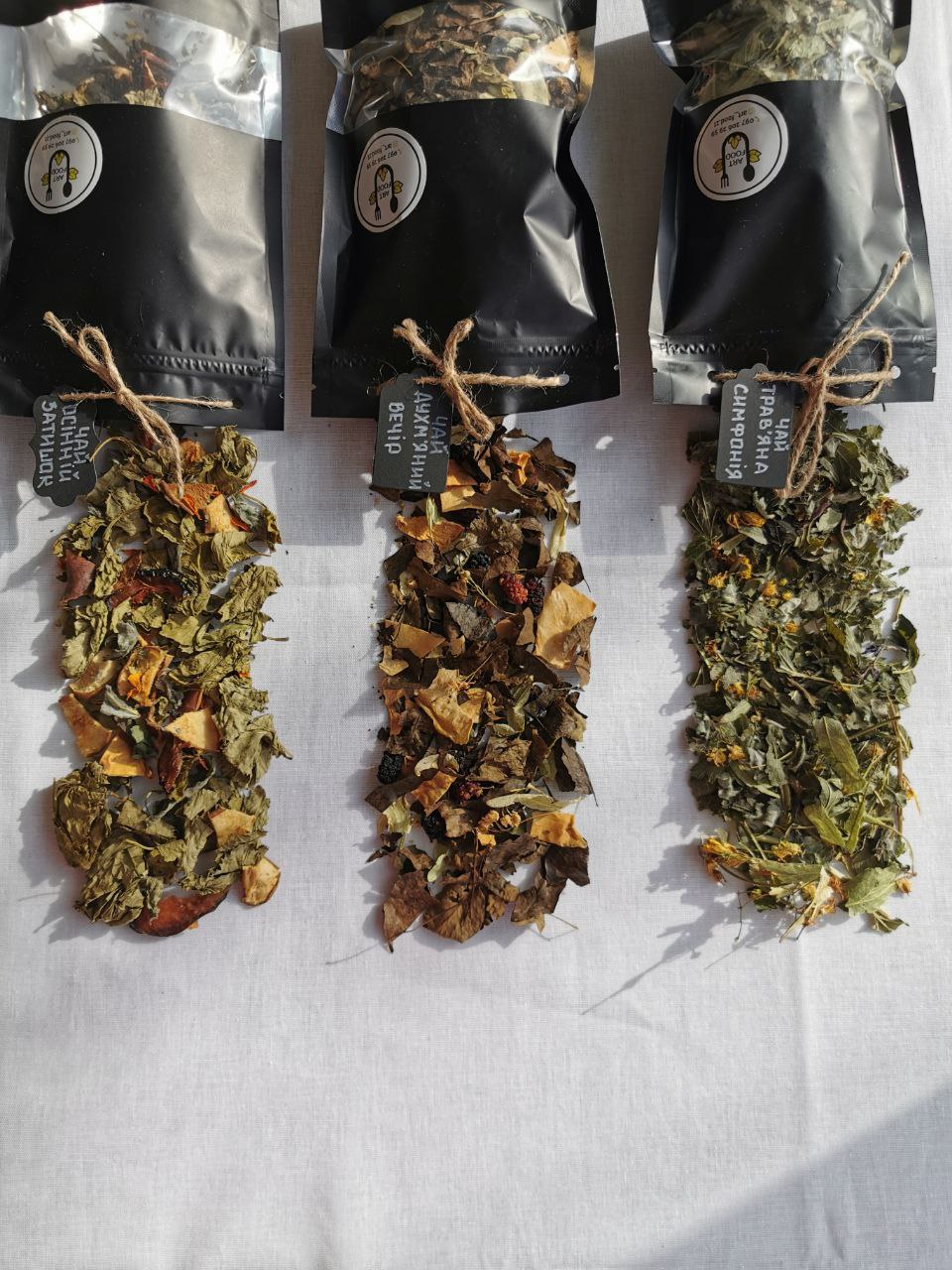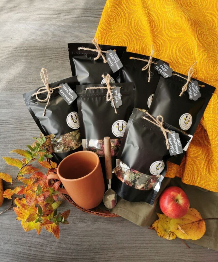 З листя і плодів фруктових дерев, із трав та квітів, зібраних у власному саду, в лісі чи у полі житомирянка Юлія створює різноманітні авторські чаї. Протягом весни-літа (з квітня по вересень) заготовляє та сушить сировину, а вже восени формує чайні композиції і відправляє замовлення.