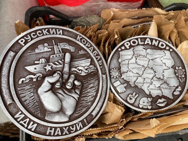Тож митець тепер зображає на своїх виробах патріотичні теми, зокрема славнозвісну цитату захисників о. Зміїний – зі вказівкою, куди йти російському кораблю.