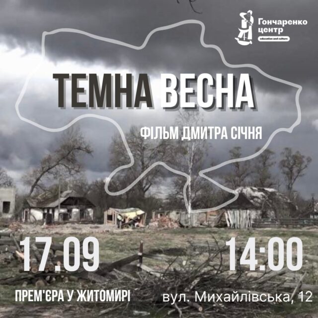 “Прем’єра фільму «ТЕМНА ВЕСНА» у Житомирі. Стрічка містить історичні свідчення мешканців населених пунктів Коростенського району Житомирської області, які постраждали внаслідок бойових дій навесні цього року. Деякі свідки подій перебували під російською окупацією. Фільм змонтований з архівних матеріалів, відзнятих режисером Дмитром Січнем”, – йдеться в повідомленні.