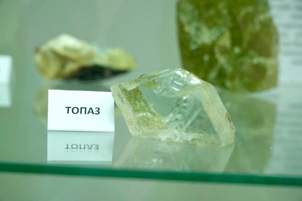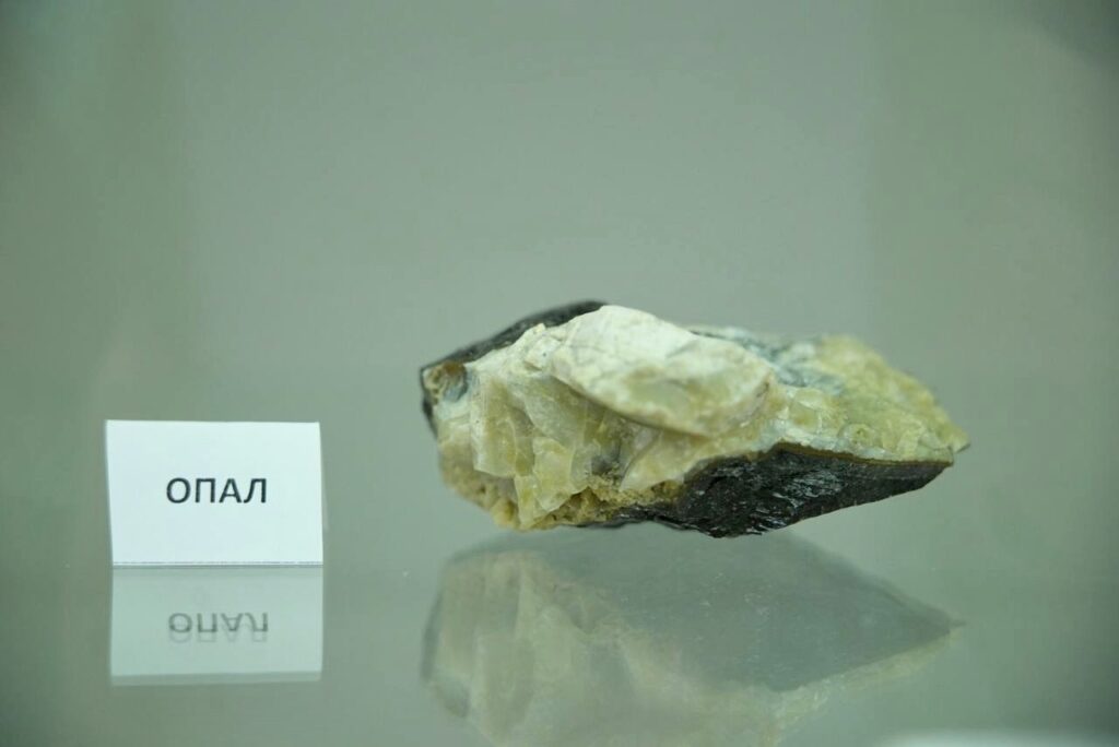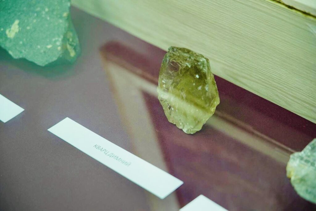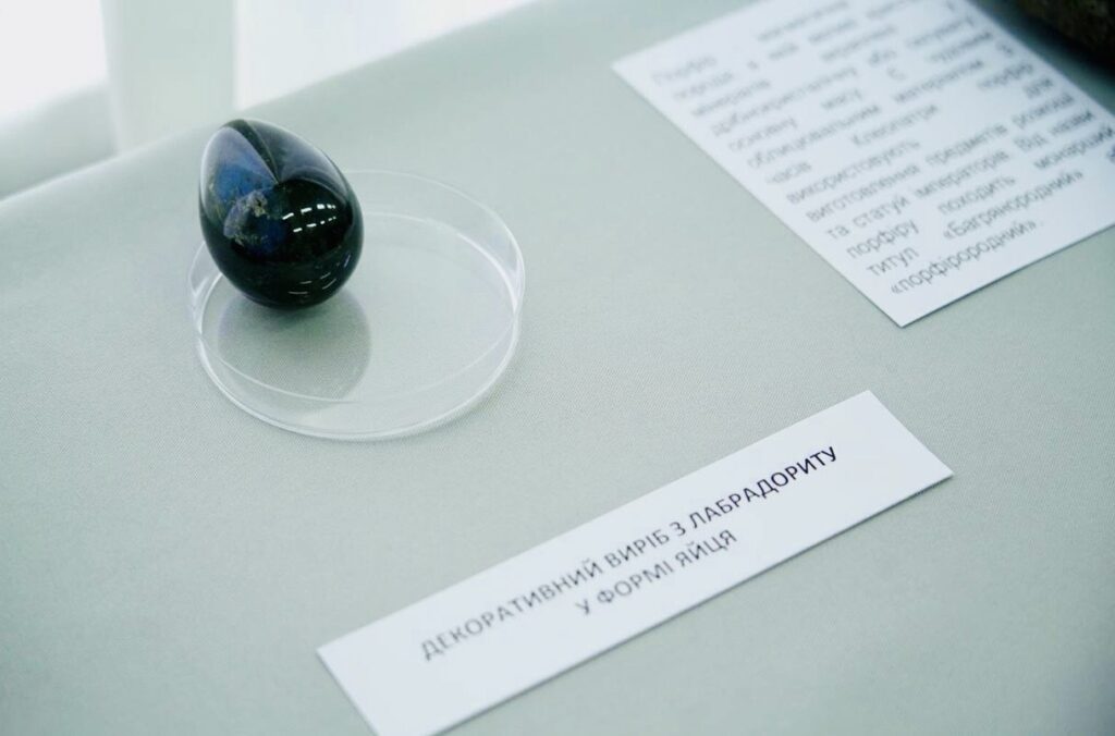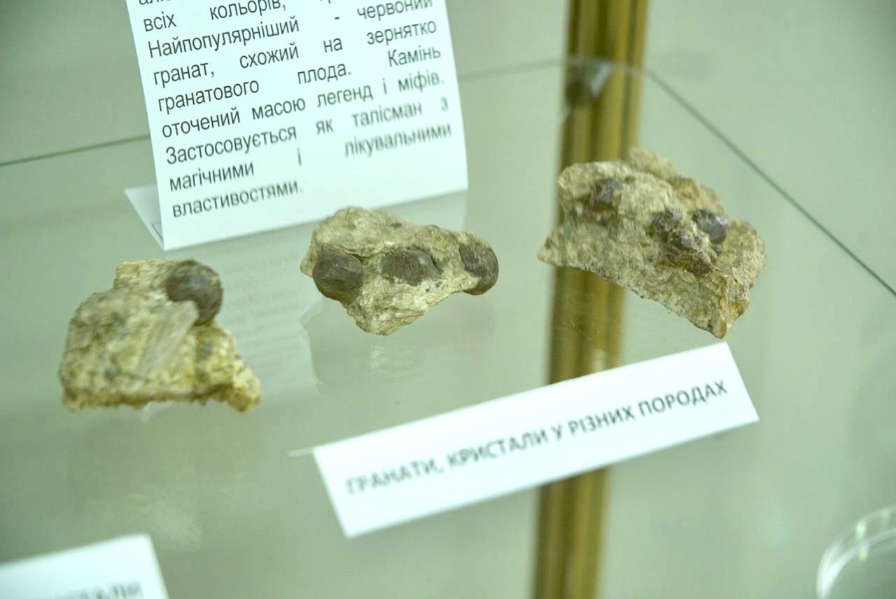 “Однією з родзинок нашої виставки є пегматит. Це така скельна гірська порода, дуже цікава тим, що вона містить у собі величезну кількість корисних копалин. Серед них є рідкісні корисні елементи, а також самоцвіти і дорогоцінне каміння. Все це добувається з наших пегматитів. Це і опал, берил, гранат, топаз та інше каміння”.