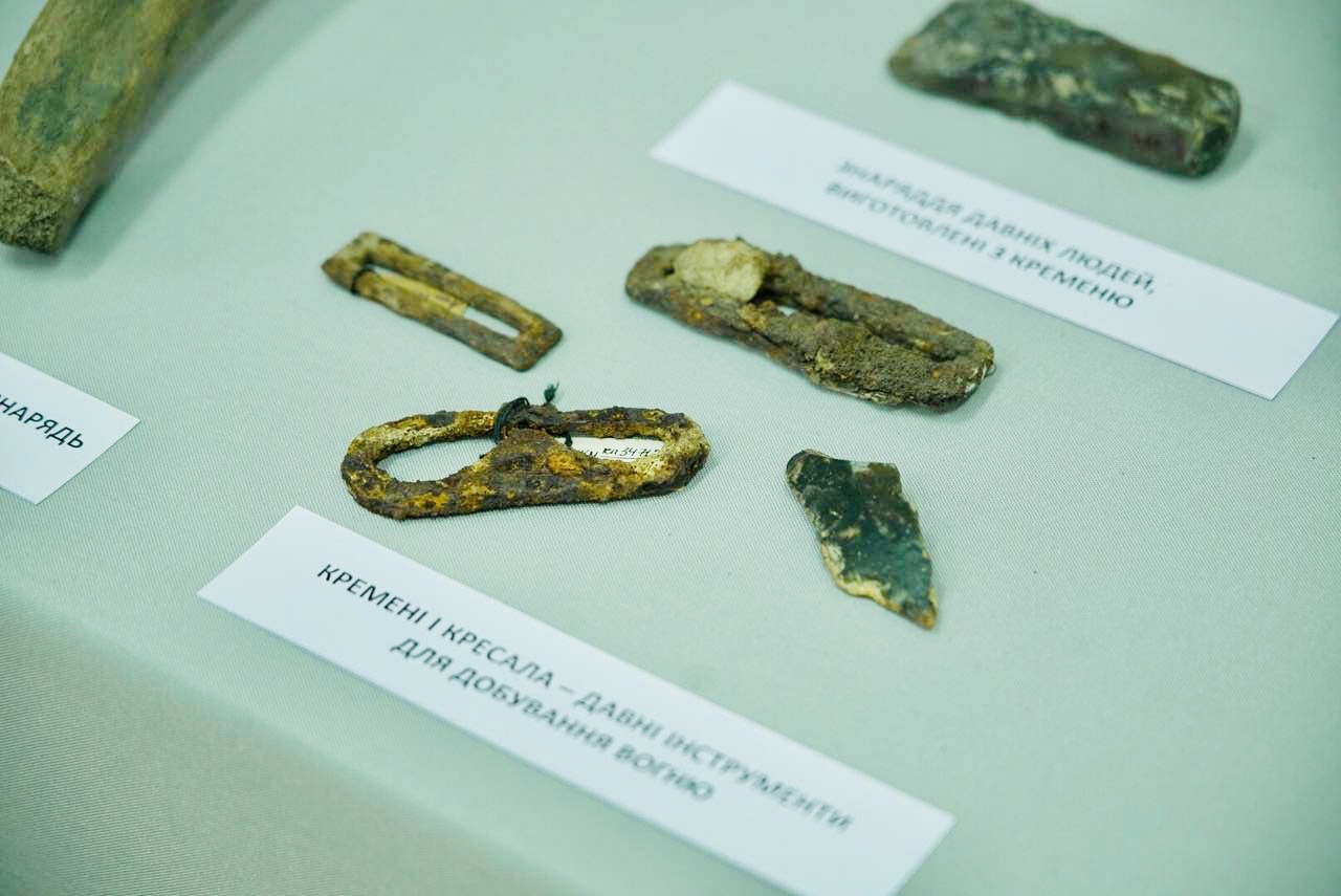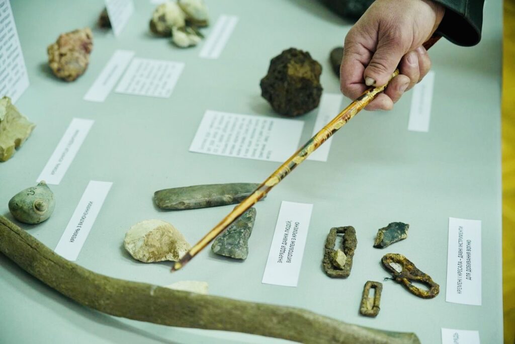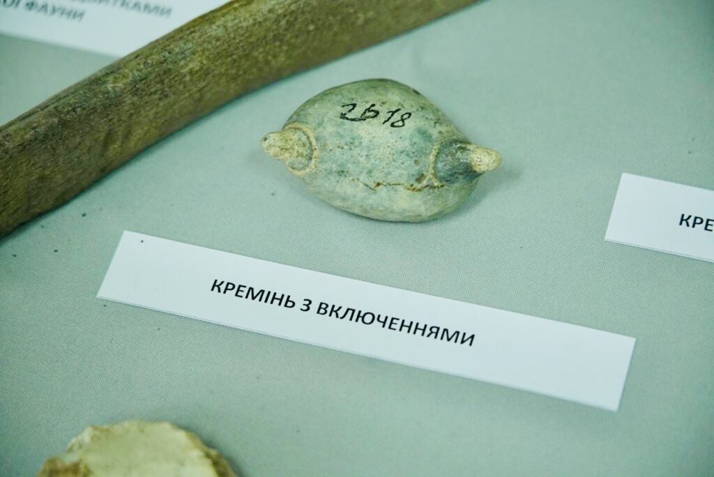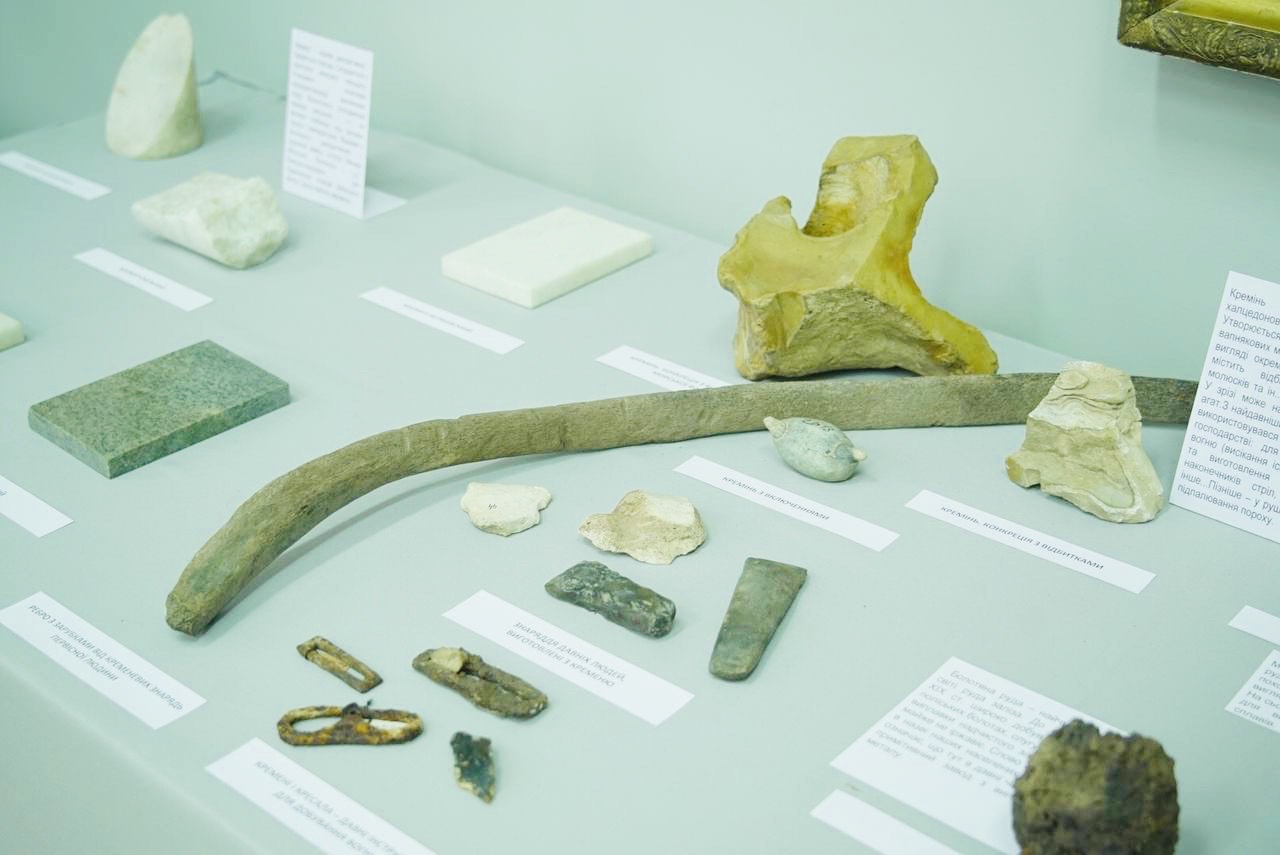 “Ще однією цікавою родзинкою нашої виставки є кремінь. Ця гірська порода цікава тим, що наші давні предки робили з неї знаряддя. Також у нас є ребро мамонта, подароване нам меценатом, із зарубками кременевих знарядь первісної людини”.