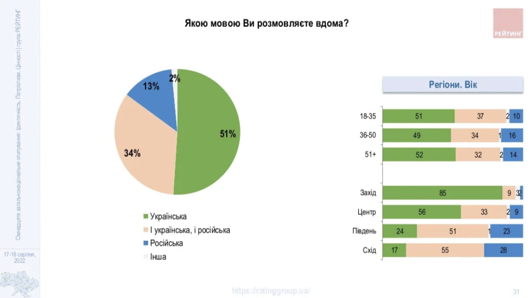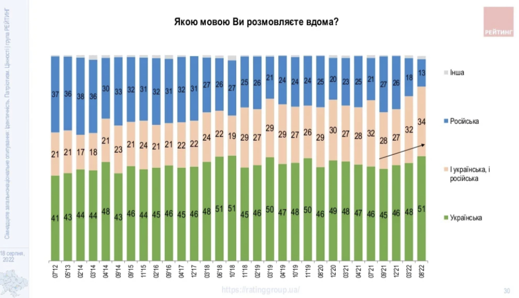 “Продовжує зростати кількість тих, хто частіше розмовляє українською вдома. Так, сьогодні 51% зазначили, що розмовляють вдома українською (у квітні 2022 – 48%), третина – двома мовами, 13% – російською. Більше половини мешканців півдня і сходу двомовні, близько чверті – російськомовні. Використання російської у побуті зменшилося приблизно вдвічі”, – повідомляють соціологи.