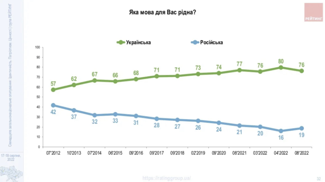 У результатах опитування зазначається, що 76% вказали українську мову як рідну, а 19% – російську. При цьому 30% російськомовних вважають своєю рідною українську.