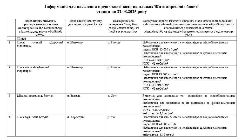 Станом на 22 серпня 2025 року на частині пляжів Житомирщини вода залишається небезпечною для купання. Про це свідчать результати лабораторних досліджень, оприлюднені обласними фахівцями.