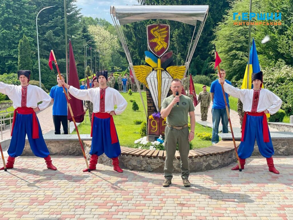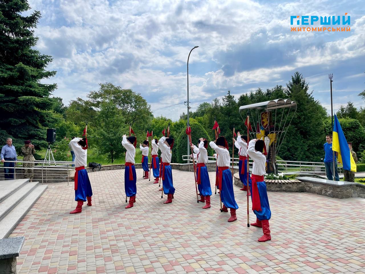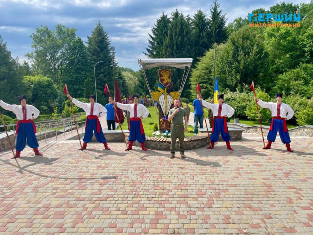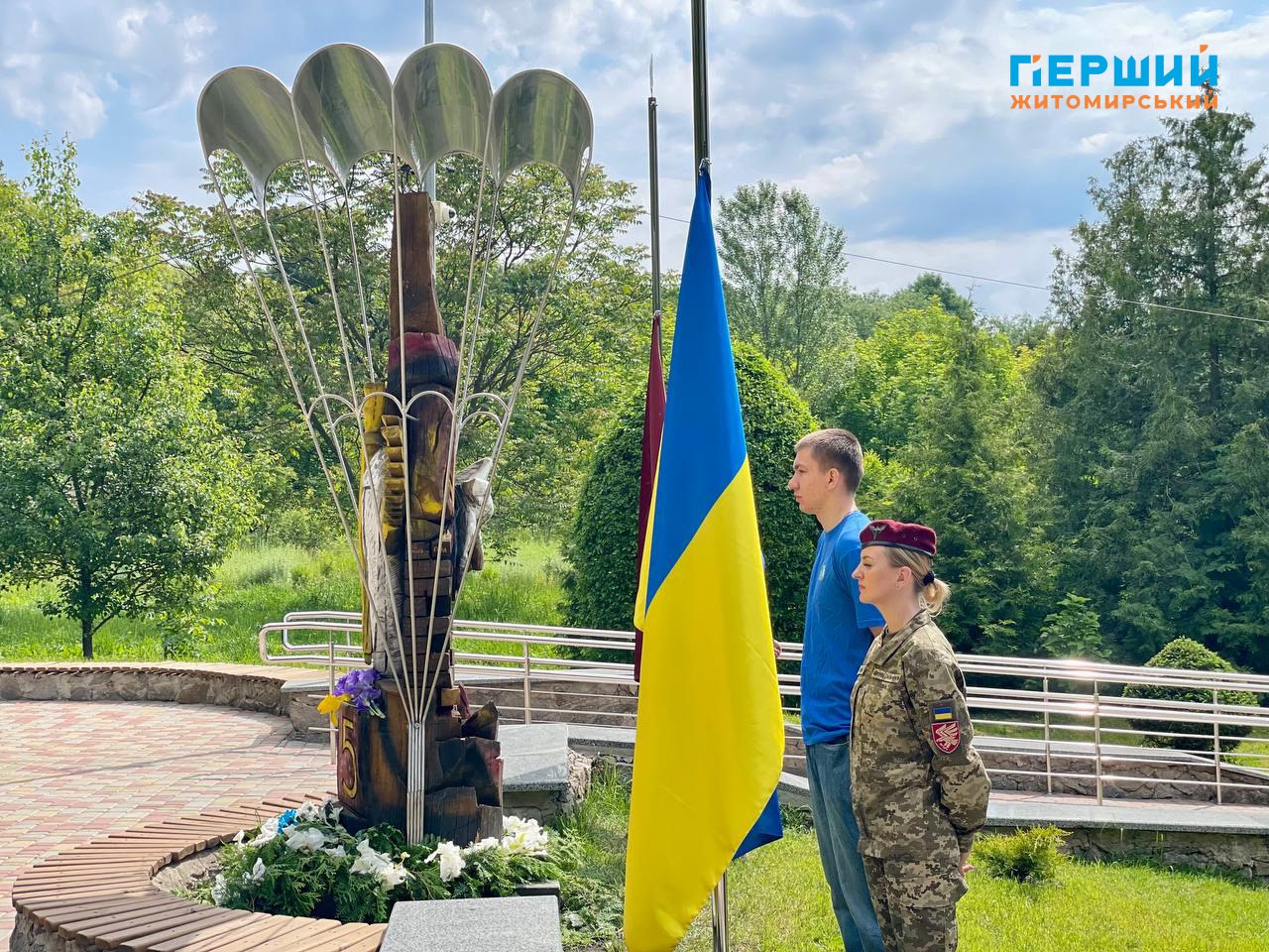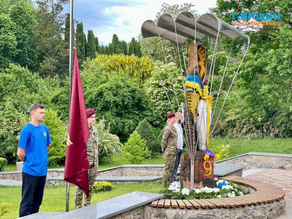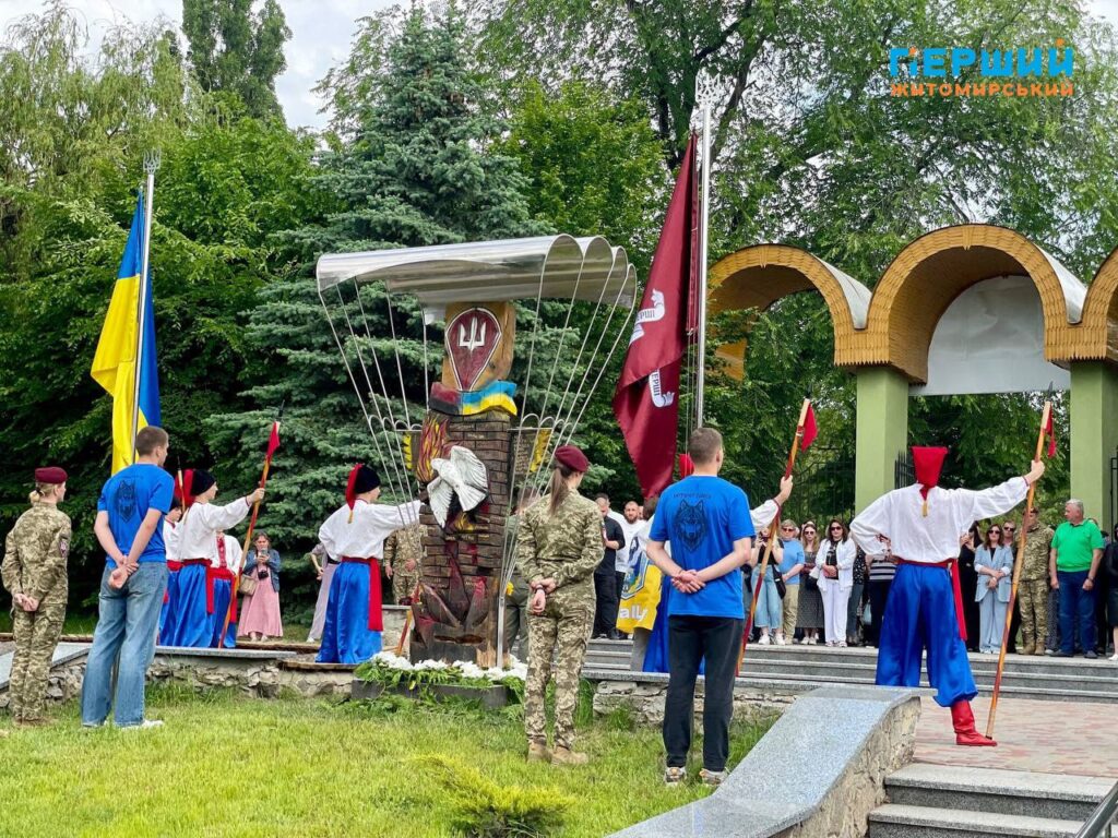 У центрі – деревʼяна скульптура майстра, ветерана 95-ї бригади, волонтера Івана Халуса, яку він вирізав у Житомирі рік тому з колоди 300-річного дуба. Її оздобили конструкцією у вигляді купола парашута.