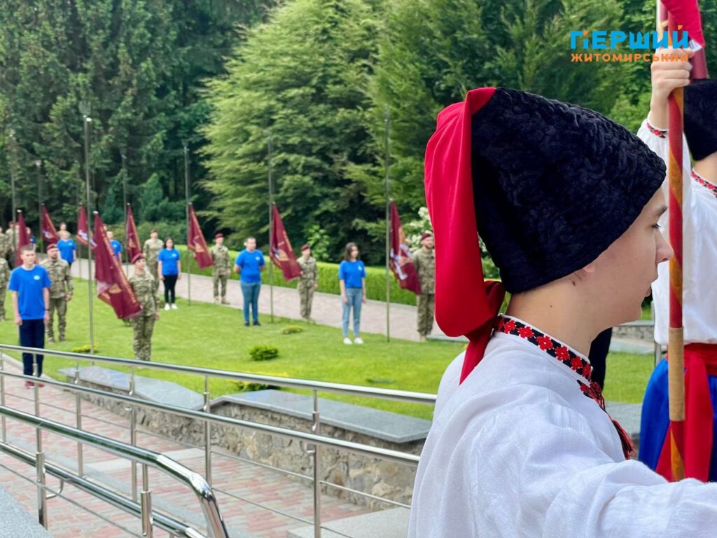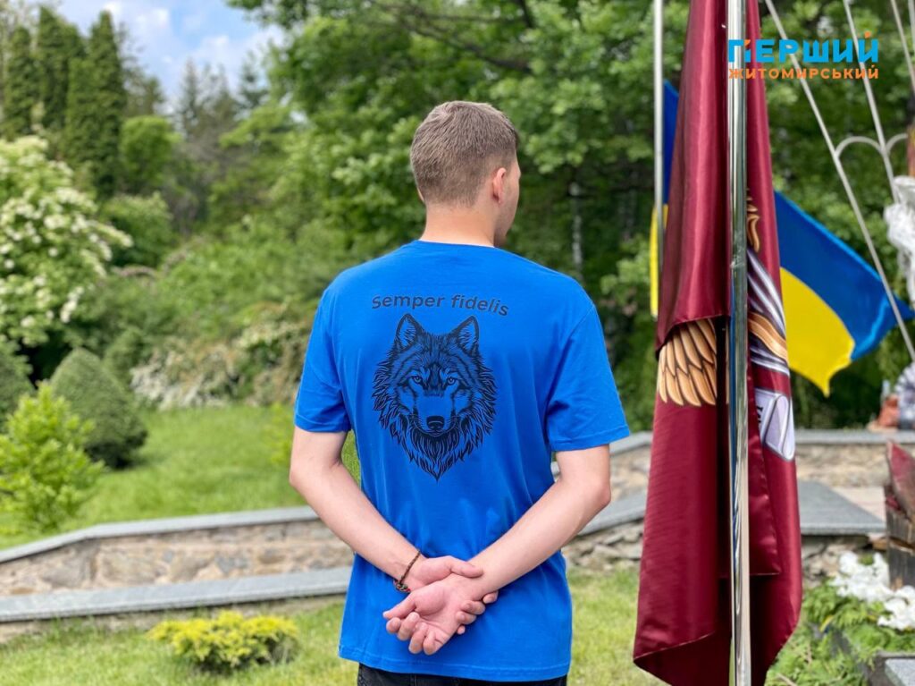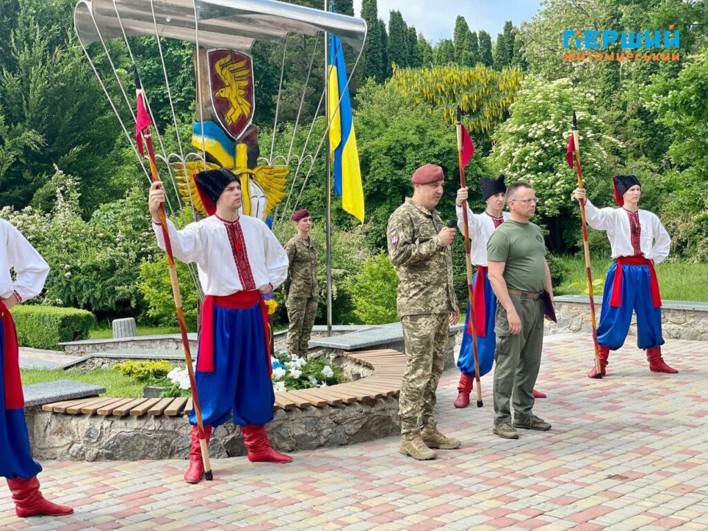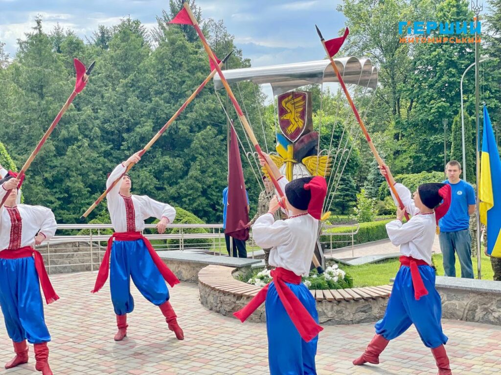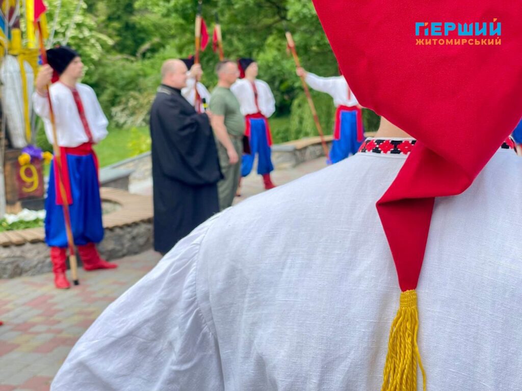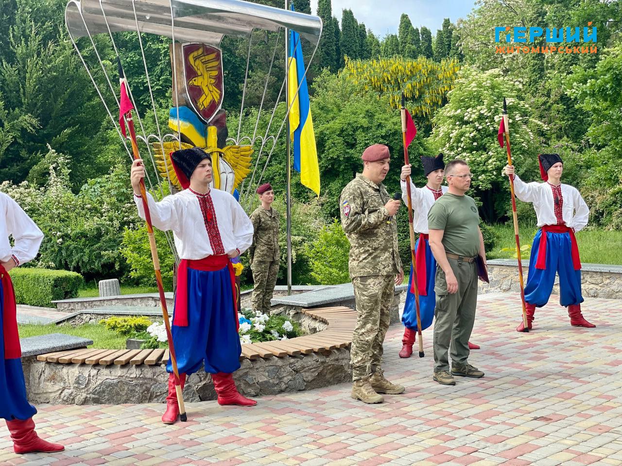 У центрі – деревʼяна скульптура майстра, ветерана 95-ї бригади, волонтера Івана Халуса, яку він вирізав у Житомирі рік тому з колоди 300-річного дуба. Її оздобили конструкцією у вигляді купола парашута.
