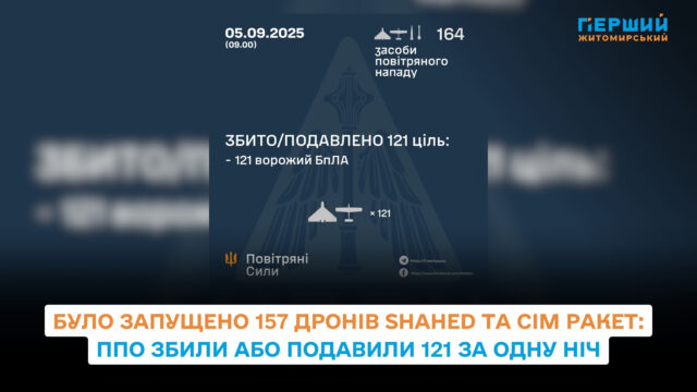 У ніч на 5 вересня українські сили протиповітряної оборони відбили чергову масштабну атаку дронів. Як повідомили у Повітряних Силах ЗСУ, противник застосував 157 ударних безпілотників типу Shahed та дрони-імітатори різних модифікацій.
