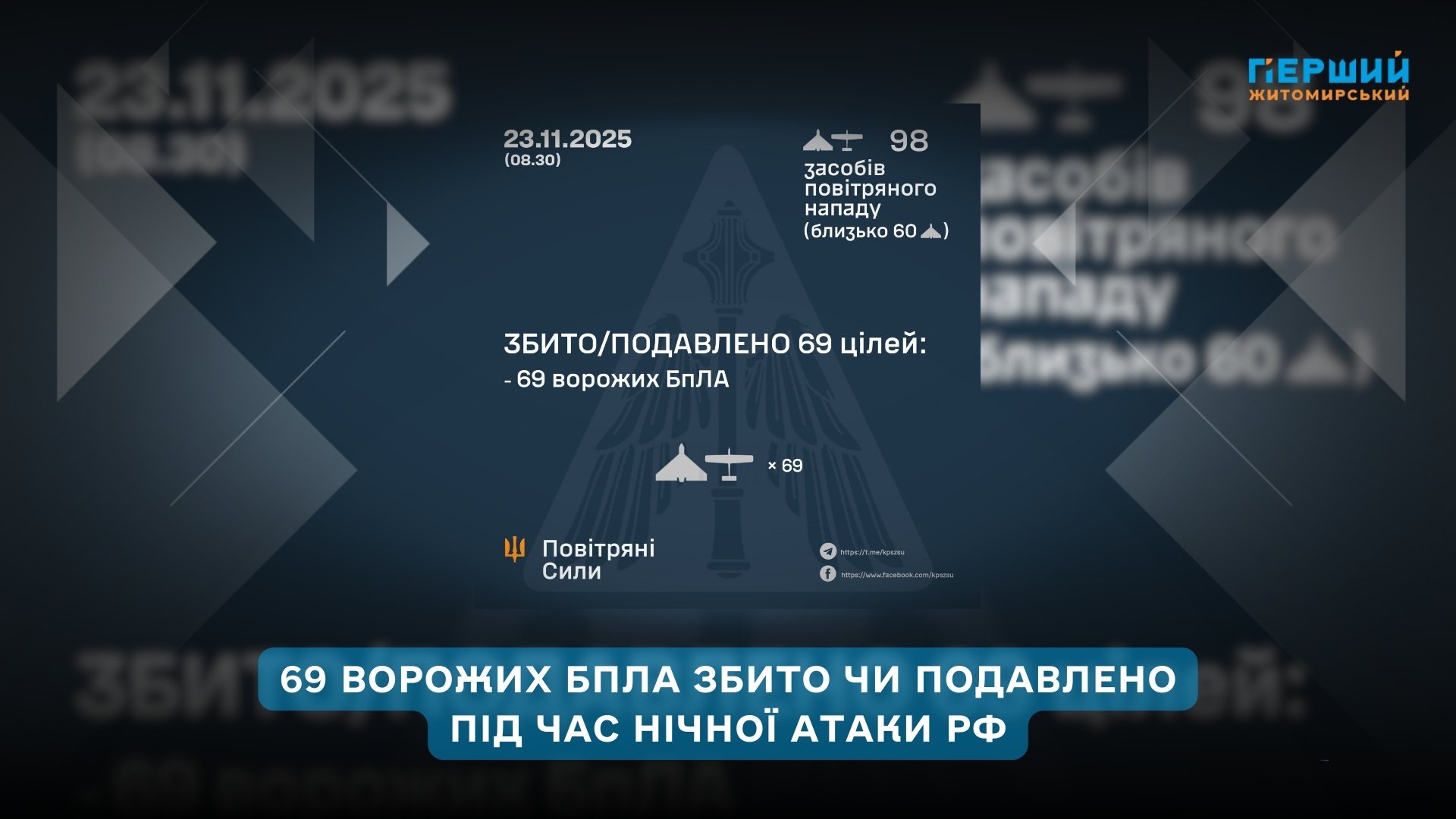 У ніч на 23 листопада сили протиповітряної оборони збили та подавили 69 ворожих ударних безпілотників над Україною. Про це повідомили у Повітряних Силах ЗСУ.