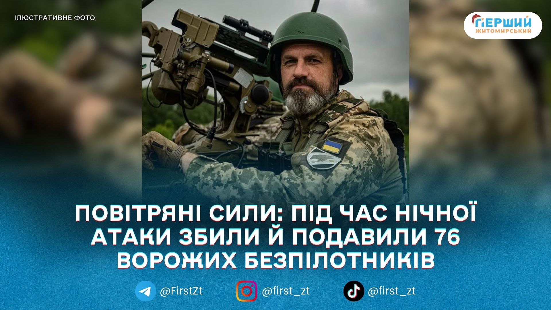 За попередніми даними станом на 08:00, сили протиповітряної оборони збили або подавили 76 ворожих БпЛА. Повітряний напад відбивали авіація, зенітні ракетні війська, підрозділи РЕБ та безпілотних систем, мобільні вогневі групи Сил оборони.
