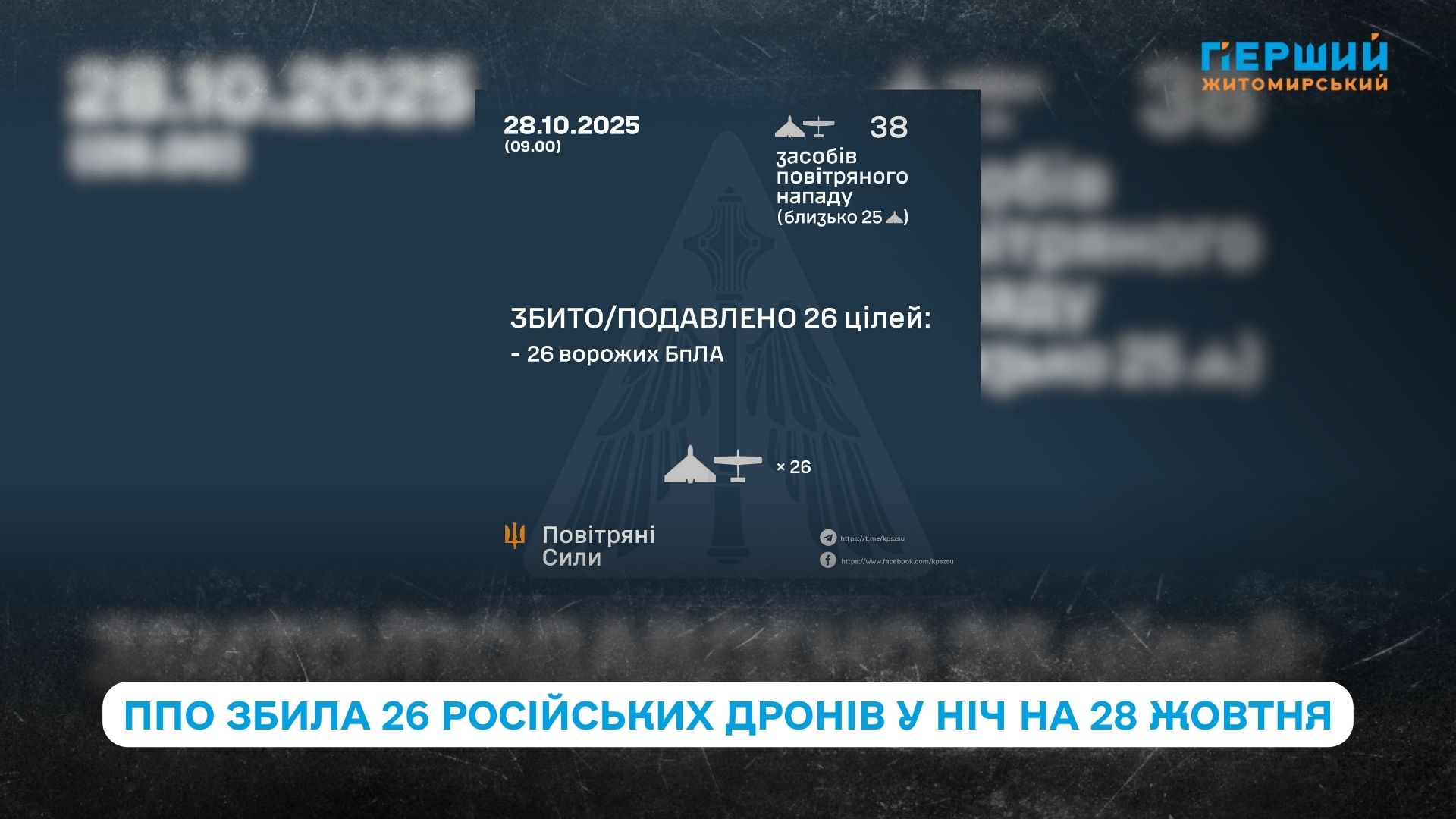 Станом на 9:00 28 жовтня збито або подавлено 26 ворожих БпЛА, зокрема ударні дрони Shahed і Гербера.