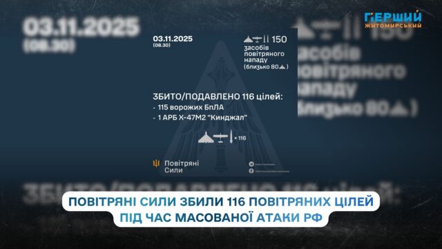 За попередніми даними станом на 08:30, українська ППО збила або подавила 116 повітряних цілей, серед них одну ракету «Кинджал» і 115 ударних БпЛА різних типів.