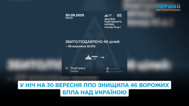 За даними на 09:00, сили протиповітряної оборони знищили або подавили 46 дронів над північними, південними, східними та центральними регіонами України. В операції брали участь авіація, підрозділи радіоелектронної боротьби, системи безпілотних комплексів та мобільні вогневі групи.