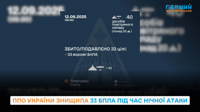 У ніч на 12 вересня Росія атакувала територію України 40 ударними безпілотниками різних типів, серед яких Shahed, «Гербера» та інші модифікації. За даними Повітряних Сил ЗСУ, пуски здійснювалися з напрямків Курська, Міллерово та Приморсько-Ахтарська (рф). Понад половину з них становили іранські Shahed.