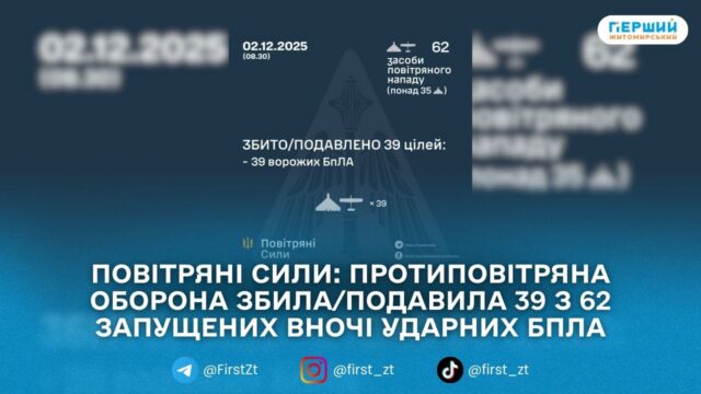 У Повітряних Силах Збройних Сил України повідомили, що у ніч на 2 грудня українська протиповітряна оборона збила/подавила 39 ворожих безпілотників. Загалом противник атакував 62 ударними БпЛА типу Shahed, «Гербера» та іншими дронами.