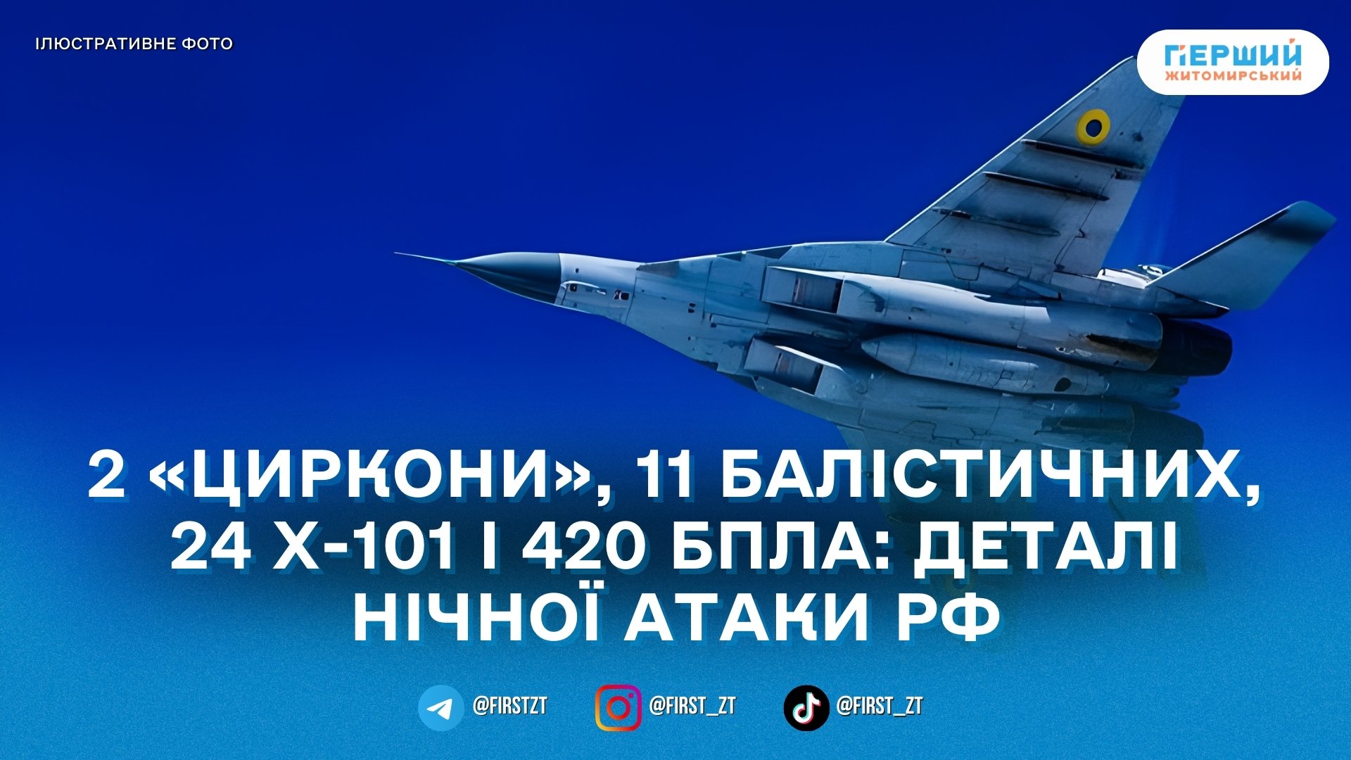 У ніч на 26 лютого Росія атакувала Україну 2 протикорабельними ракетами «Циркон», 11 балістичними ракетами «Іскандер-М»/С-400, 24 крилатими ракетами Х-101, 2 керованими авіаційними ракетами Х-69 та 420 ударними БпЛА різних типів. Про це повідомили Повітряні Сили ЗСУ.