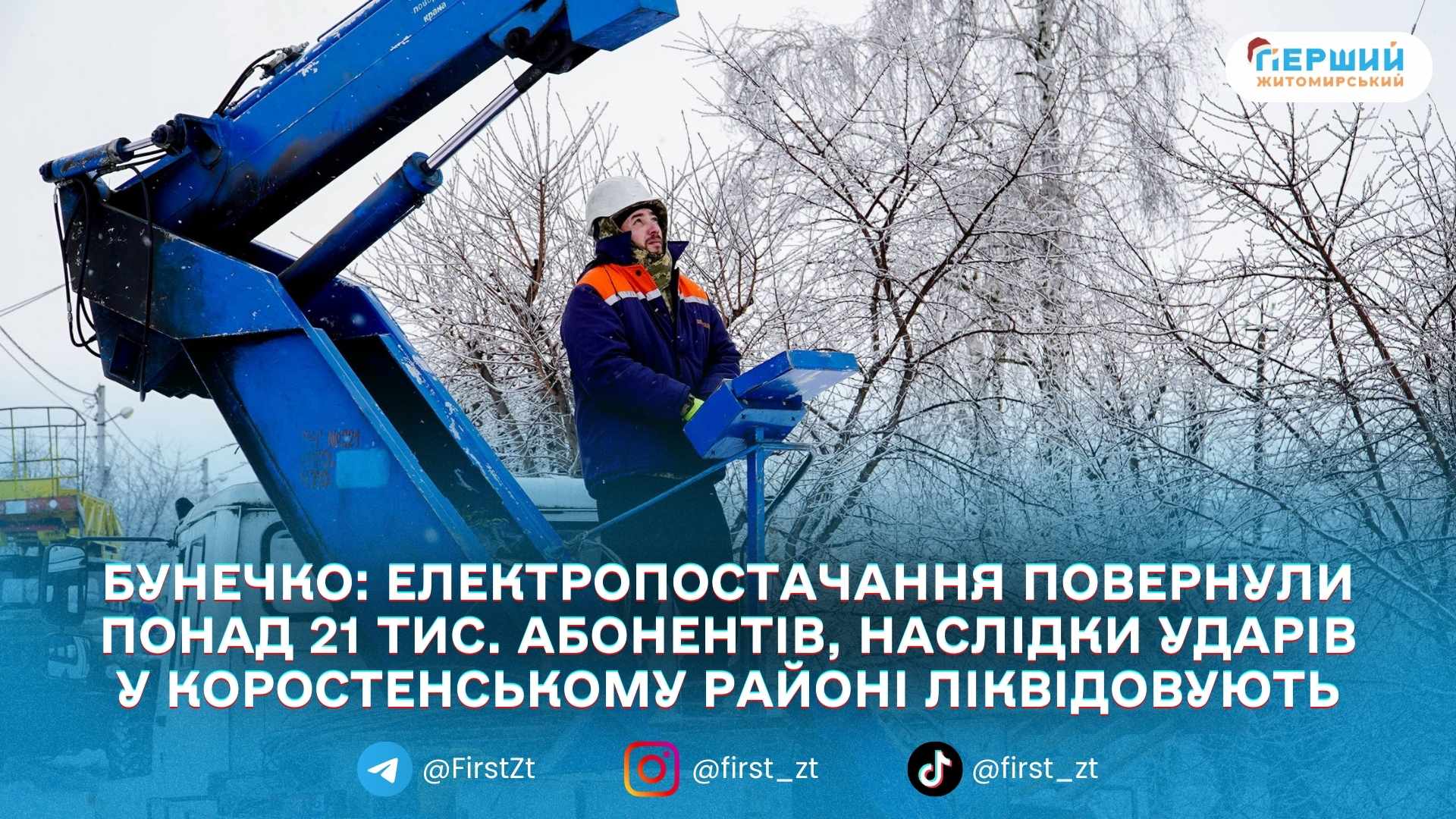 На Житомирщині відновили електропостачання для понад 21 тисячі абонентів, які залишилися без світла внаслідок російських атак. Про це ввечері 15 січня повідомив начальник Житомирської ОВА Віталій Бунечко.
