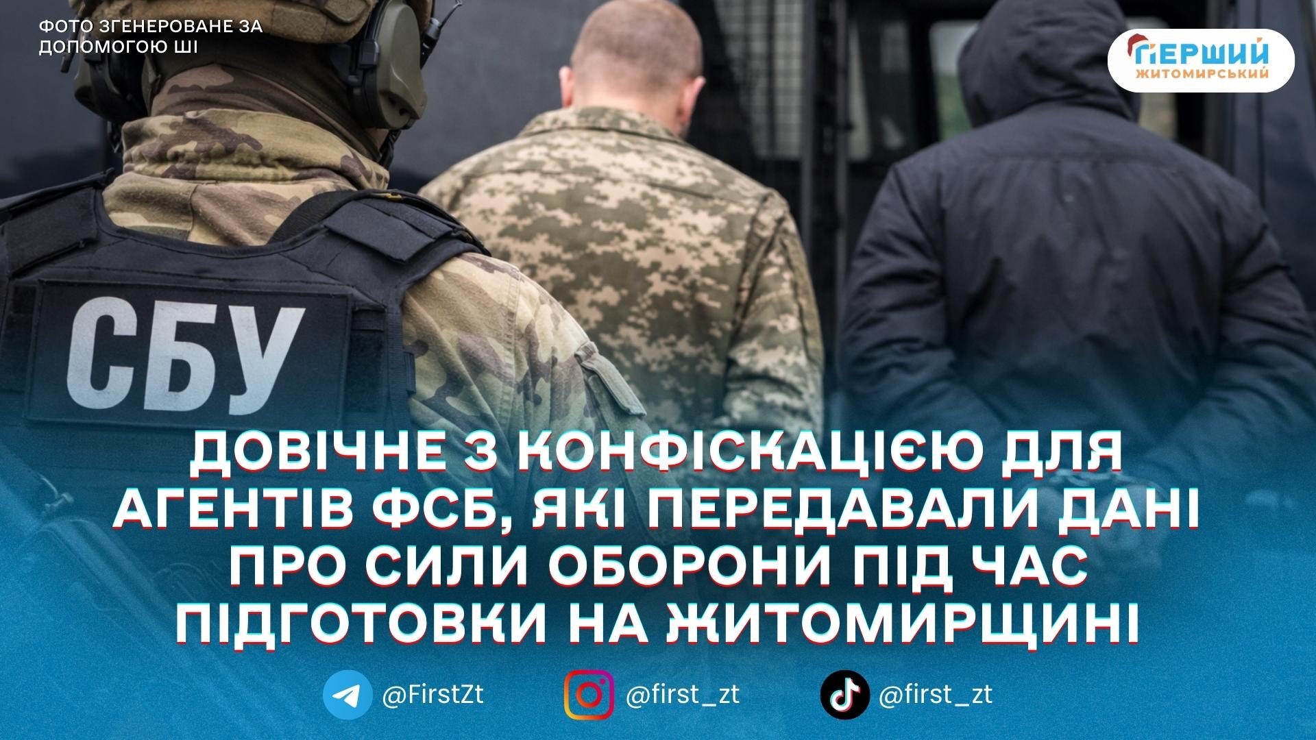 Двоє агентів ФСБ отримали довічне ув’язнення з конфіскацією майна. За даними СБУ, один із засуджених під час підготовки у навчальному центрі в Житомирській області почав передавати окупантам інформацію про дислокацію Сил оборони.
