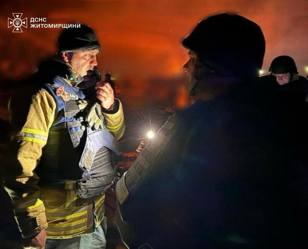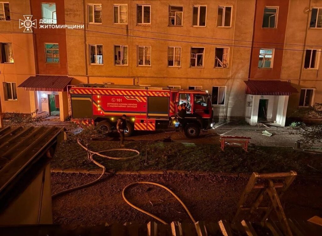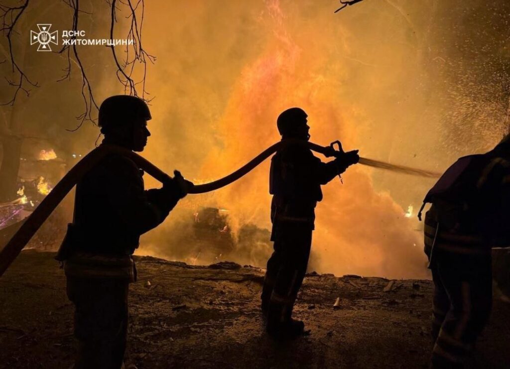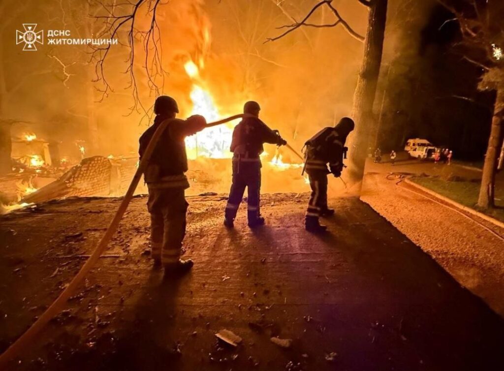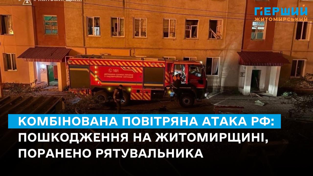 У ніч на 23 квітня Житомирщина зазнала кількох комбінованих повітряних ударів з боку РФ. Унаслідок обстрілу були пошкоджені приватні гаражі та виникла масштабна пожежа, що охопила площу 2500 кв. м. Також вибуховою хвилею вибито вікна у багатоквартирних житлових будинках. Про це повідомляє голова Житомирської ОВА Віталій Бунечко.