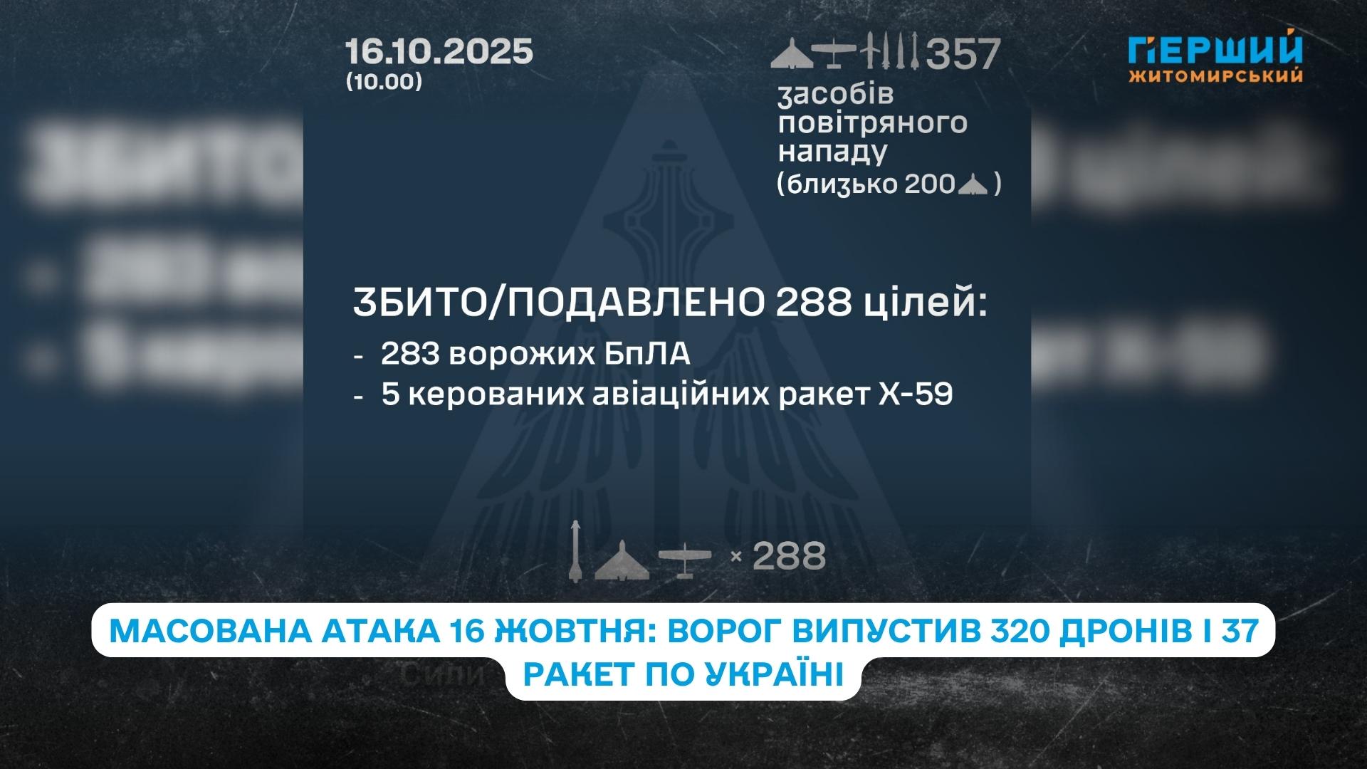 За даними Повітряних Сил, радіотехнічні війська виявили та супроводжували 357 засобів повітряного нападу — серед них 37 ракет (28 із них — балістичні) та 320 дронів різних типів.