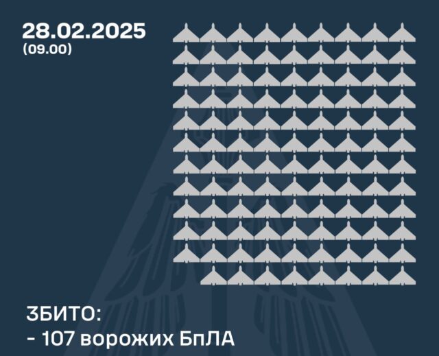 Станом на 09:00 підтверджено знищення 107 ударних безпілотників типу Shahed та дронів інших моделей. Основні райони збиття – Харківська, Полтавська, Сумська, Київська, Чернігівська, Черкаська, Вінницька, Житомирська, Кіровоградська, Дніпропетровська, Запорізька, Херсонська та Миколаївська області.