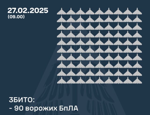 Станом на 09:00 підтверджено знищення 90 ударних дронів у різних регіонах: