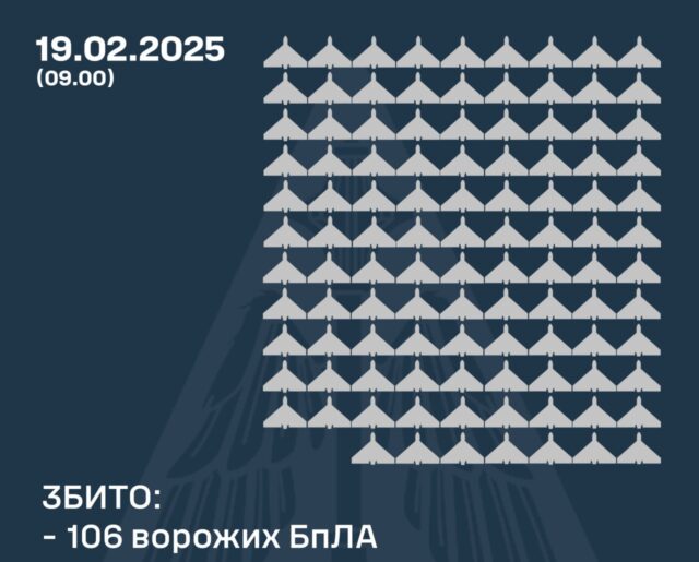 У ніч на 19 лютого російські війська здійснили масовану атаку, випустивши 167 ударних дронів типу Shahed та безпілотників-імітаторів з території рф. Крім того, по Сумщині завдано удару двома балістичними ракетами Іскандер-М/KN-23. Про це повідомляють Повітряні сили ЗС України.