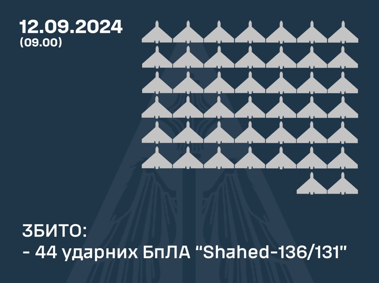 У ніч на 12 вересня 2024 року радіотехнічні війська Повітряних Сил України виявили та супроводжували 69 засобів повітряного нападу противника станом на 9:00 ранку.