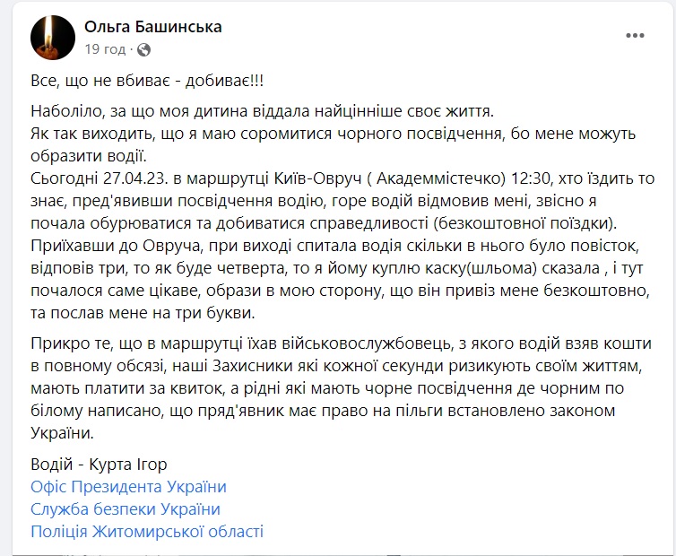 “Наболіло, за що моя дитина віддала найцінніше – життя. Як так виходить, що я маю соромитися чорного посвідчення, бо мене можуть образити водії. Вчора, 27 квітня, в маршрутці Київ-Овруч ( Академмістечко) 12:30 в маршрутці їхав військовослужбовець, з якого водій взяв кошти в повному обсязі”, – пише жінка.