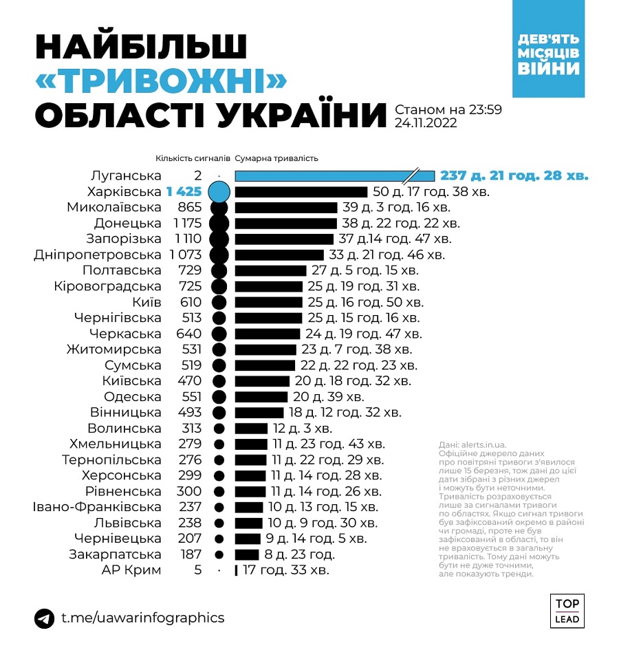 “Повітряна тривога в кожній області України.Як і раніше, в Луганській вона найбільш тривала, а сигнал тривоги фактично не вимикається.На Харківщині тривога лунала майже півтори тисячі разів. Найбільш спокійне в цьому плані Закарпаття”, – йдеться в повідомленні.