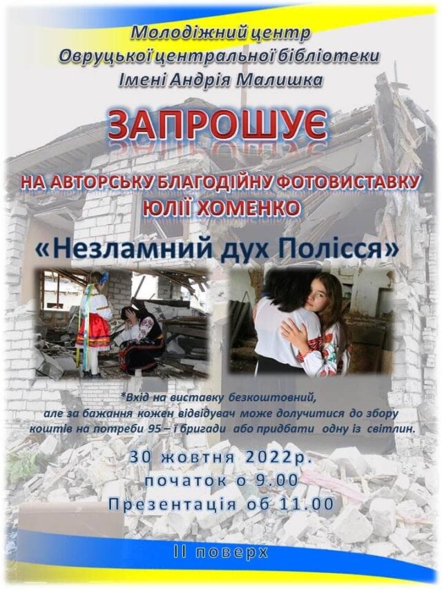 “Запрошуємо на авторську фотовиставку Юлії Хоменко”Незламний дух Полісся”. Виставка проходитиме на другому поверсі бібліотеки, – йдеться в повідомленні.