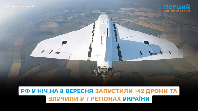 У ніч на 8 вересня російські війська здійснили чергову масовану атаку дронами. За даними Повітряних Сил ЗС України, у повітрі було зафіксовано 142 ударні безпілотники Shahed, «Гербера» та апарати інших типів. Понад сотню становили Shahed.