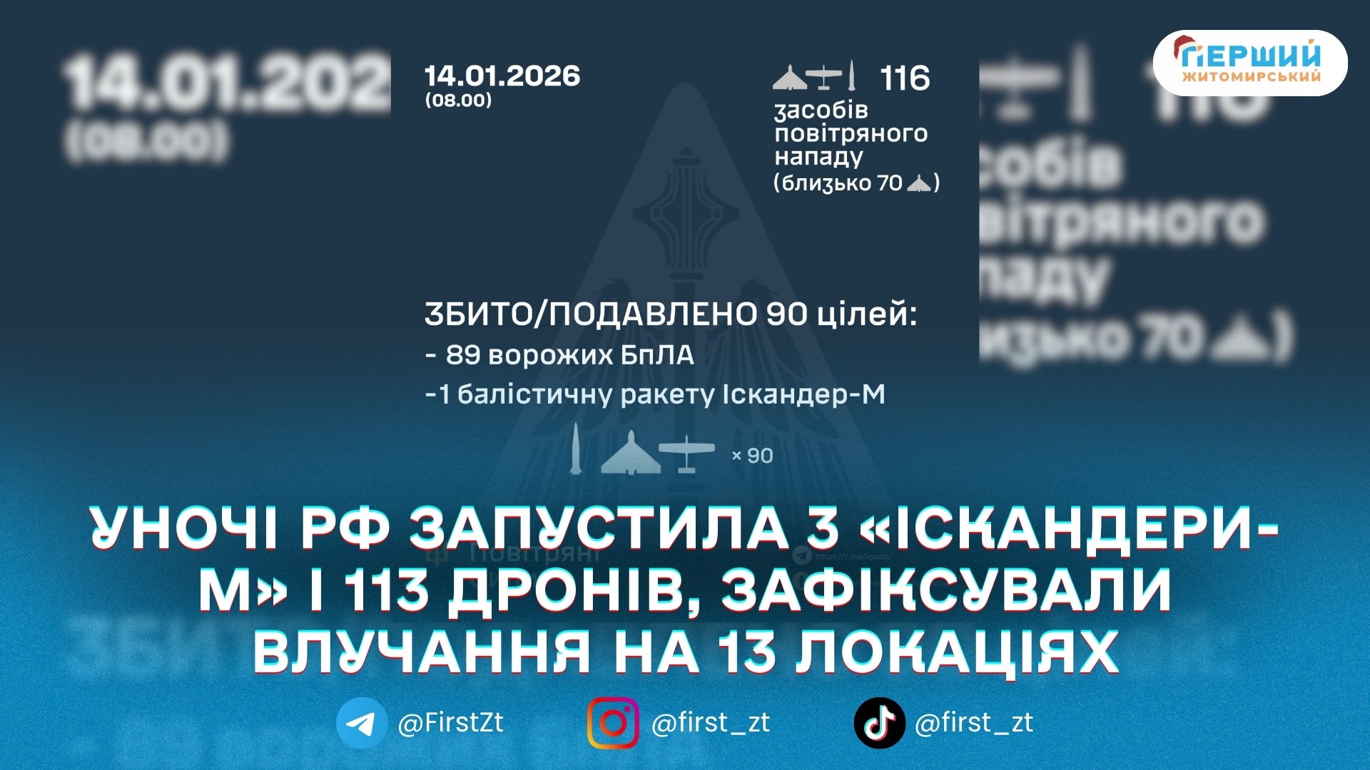 У ніч на 14 січня (із 18:30 13 січня) російські війська атакували Україну трьома балістичними ракетами «Іскандер-М» та 113 ударними безпілотниками типу Shahed, «Гербера» і дронами інших типів. Про це повідомили Повітряні Сили ЗСУ.