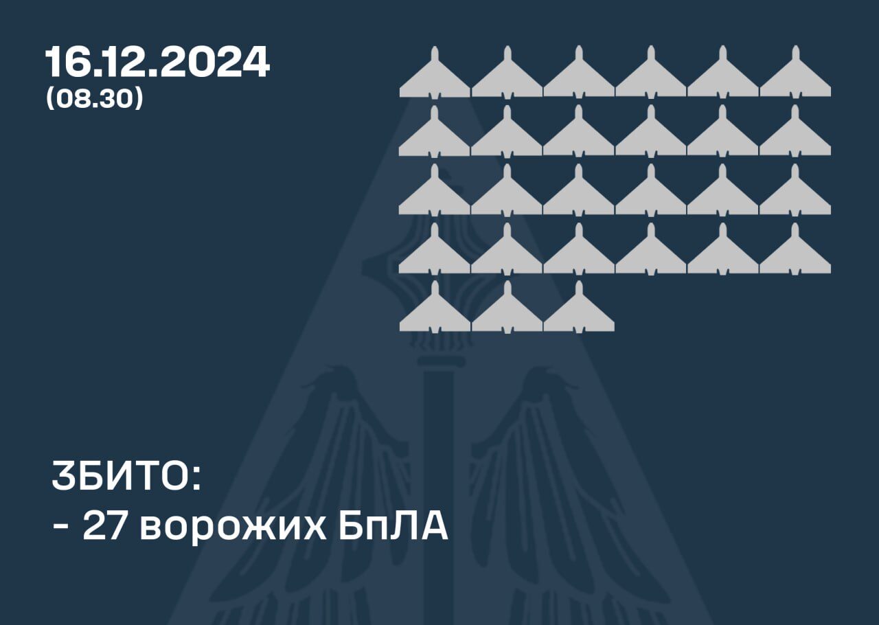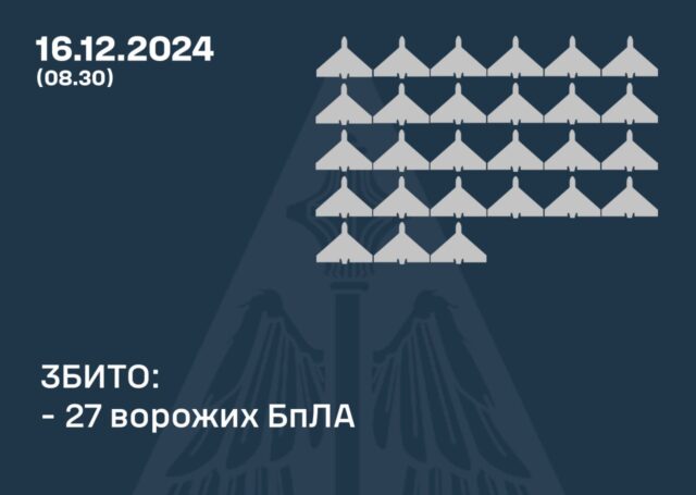 Станом на 08:30 вдалося збити 27 ударних дронів у різних регіонах України: