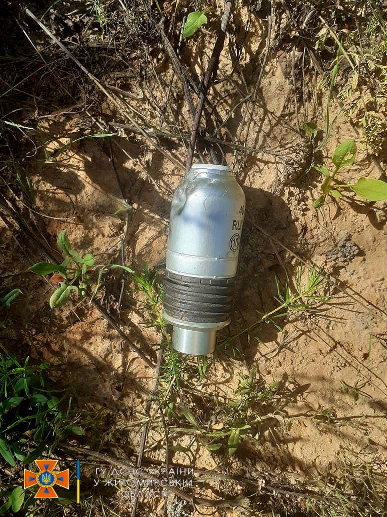 Елемент від реактивного боєприпасу РСЗВ «Ураган» виявили місцеві поблизу с. Білий Берег на Житомирщині під час збирання грибів. Також на подвір’ї приватного будинку у с. Нова Рутвянка жителі знайшли гранатометний постріл ВОГ-25.
