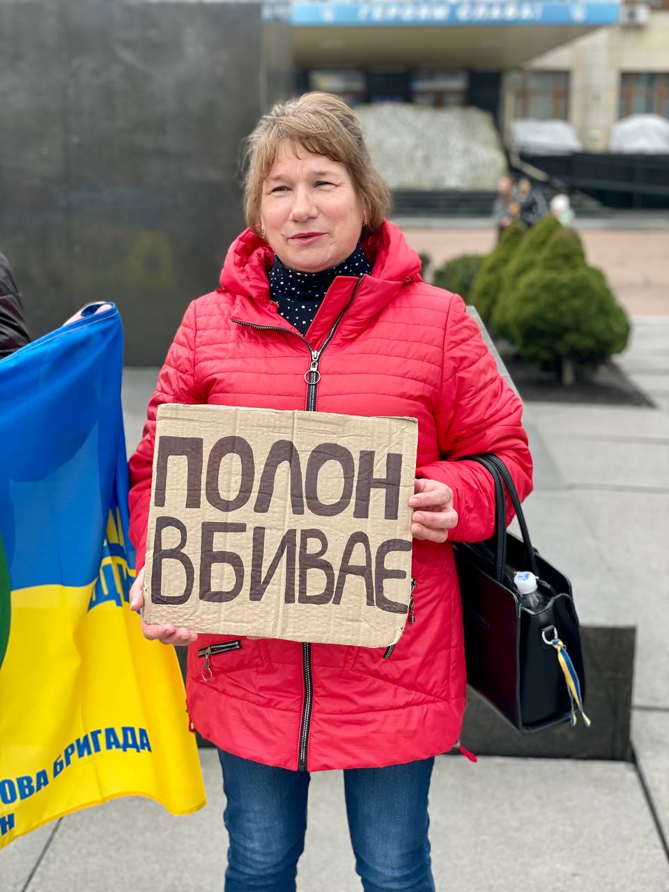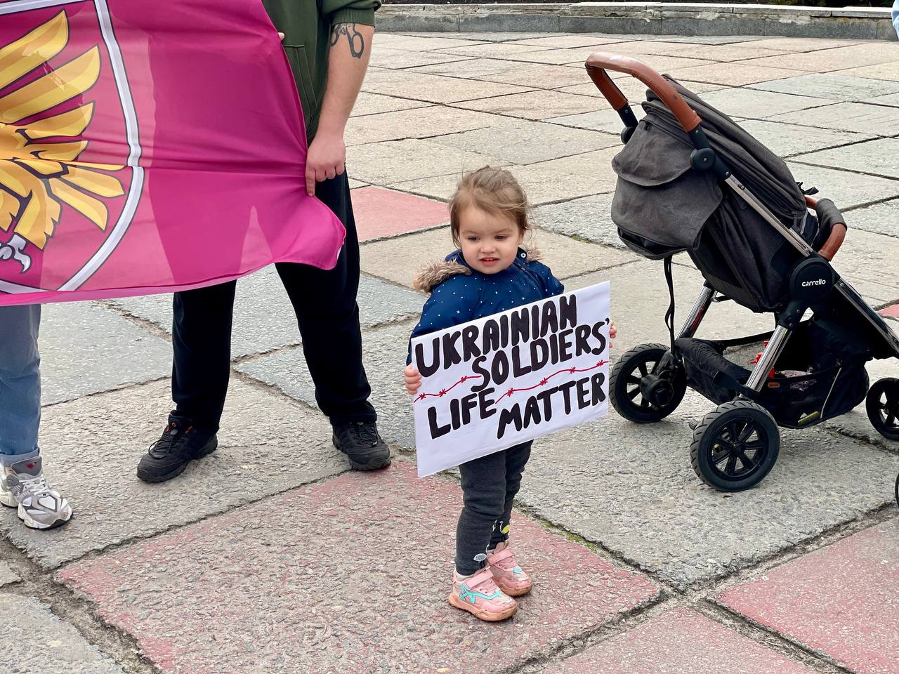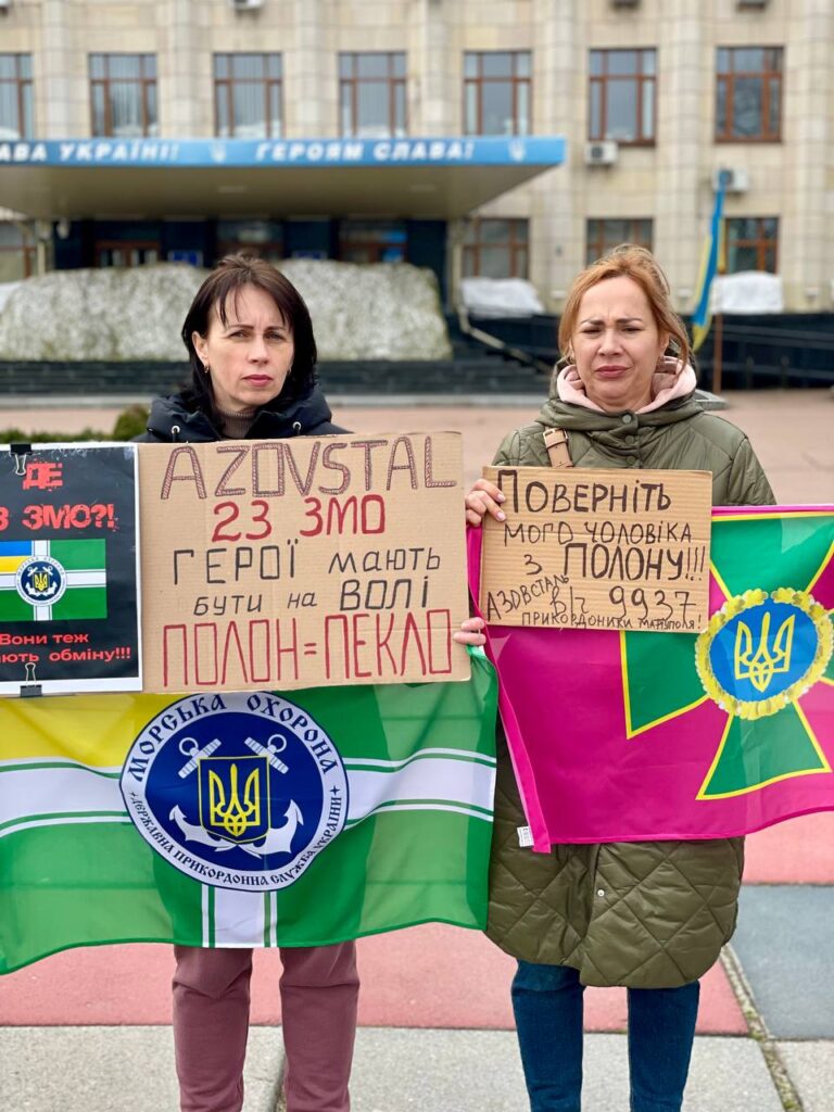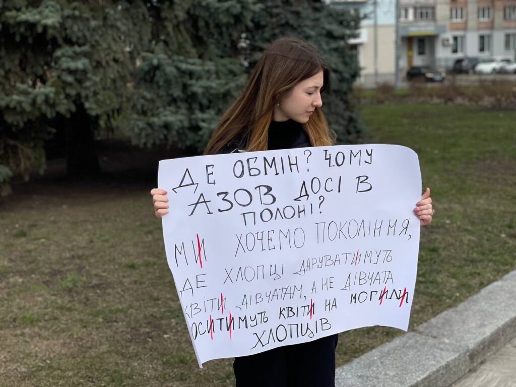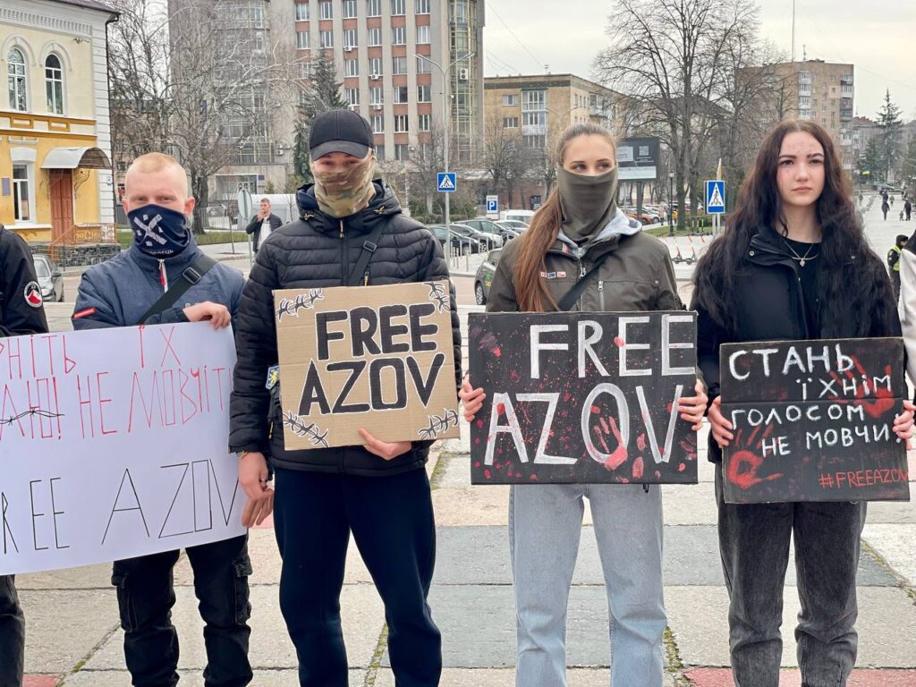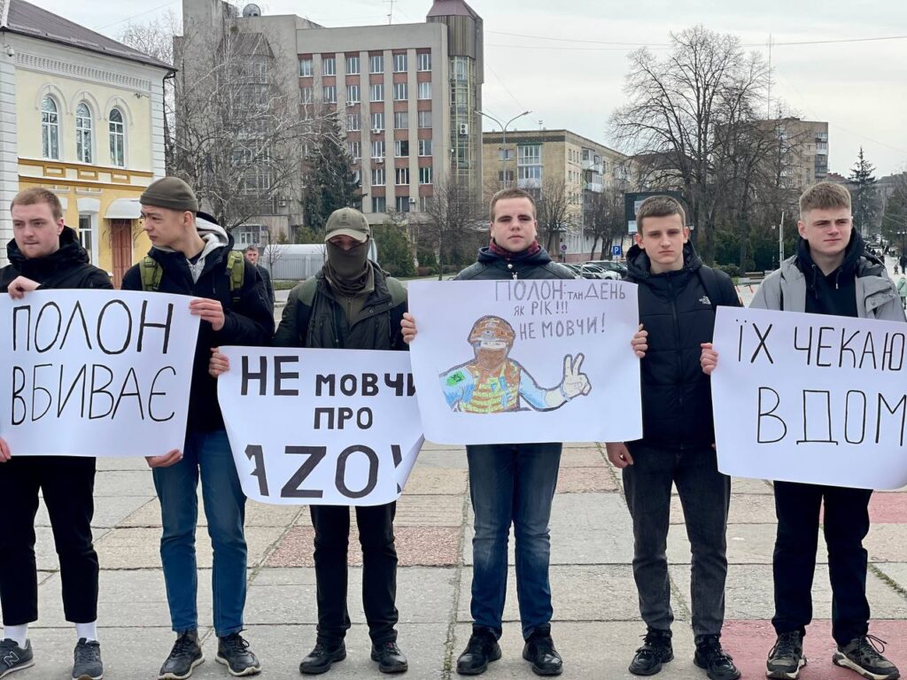 В руках тримають національну символіку та символіку військових підрозділів, плакати із написаними “Поверніть наших героїв”, “Полон вбиває”, “Не мовчи про “Азов”, “День тут – рік там”, “Де обмін? “Азов” досі в полоні”, “Поверніть мого сина”, “Вони досі в полоні. Їх катують”, “Їх чекають вдома”, “Скільки їх повинно загинути в полоні, аби про них згадали?”, “Медики в полоні” та ін.