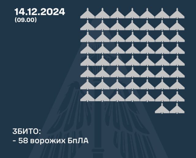 - Збито 58 ударних БпЛА у таких областях: Чернігівській, Сумській, Київській, Полтавській, Черкаській, Вінницькій, Одеській, Миколаївській, Харківській, Дніпропетровській, Кіровоградській.