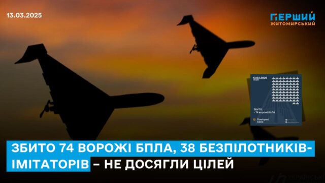 Знищено 74 ударні дрони, які летіли в бік Харківської, Полтавської, Сумської, Чернігівської, Київської, Хмельницької, Вінницької, Дніпропетровської, Запорізької, Одеської та Миколаївської областей.